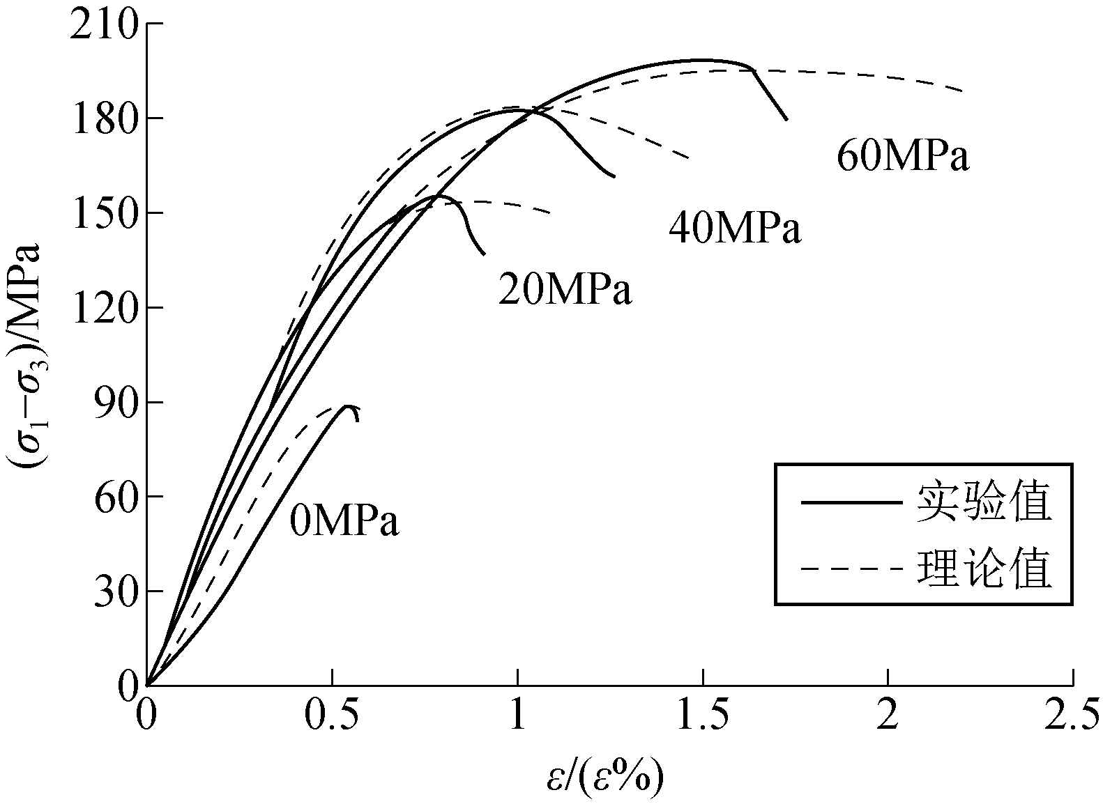 (8) 式中:ε1m——应力峰值点对应的轴向应变值,ε%。 根据图1的实验数据,得到式(7)中a、b、c的参数值,改进的邓肯- 张模型对不同围压下的岩石应力应变试验曲线的拟合结果如图6所示。由图6可知,应力峰值前,试验曲线与理论曲线吻合得很好,误差小于3%,改进的模型能更好地描述岩石的初始压密、弹性变形、应变硬化阶段。应力峰值后,试验中砂岩具有脆性特性,破坏阶段下降得较快,而理论曲线下降速度较慢,误差较大。