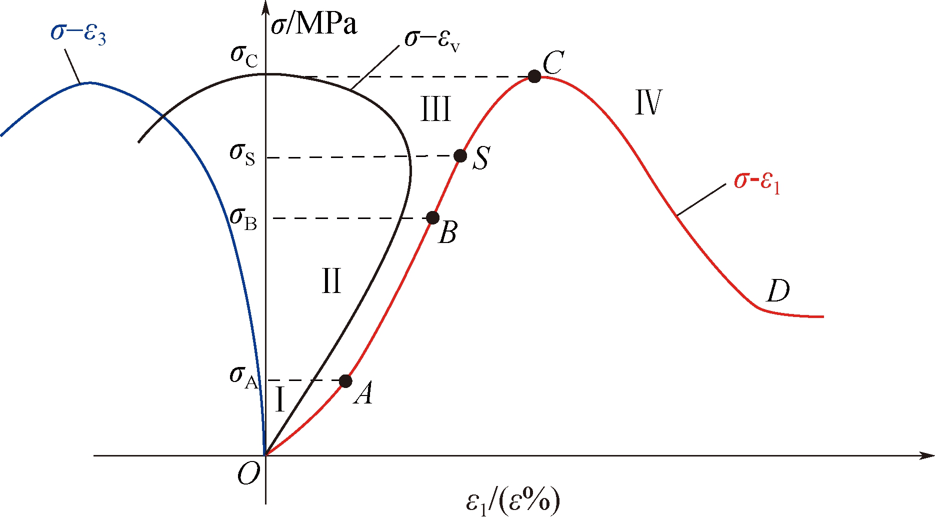 (6) 式中:Rf——破裂比; (σ1-σ3)f——破裂时的主应力差,MPa; C——内聚力,MPa; φ——内摩擦角,(°); S——应力水平。 3 邓肯- 张本构方程的改进邓肯- 张方程没有考虑中间主应力σ2对土体强度和变形的影响,模型的双曲线不能描述岩石的破坏阶段。为了能反应岩石变形规律,改进的邓肯- 张模型应力- 应变关系式(7)所示,全应力- 应变曲线图5所示。由图5可知,模型改进后全应力- 应变曲线能反应岩石变形的4个阶段。