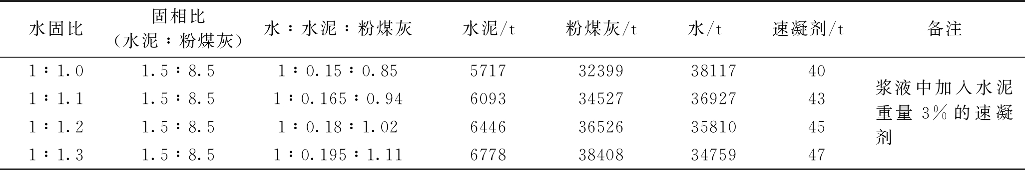图1 研究区下伏采空区稳定性分区 (1)稳定区是位于移动盆地最外边界线以外,也就是以地表移动和变形都为零的边界以外区域,不受采空区的影响,研究区内稳定区面积为1281951 m2。 (2)基本稳定区是位于移动盆地的最外边界线与裂缝边界线之间的区域,面积为624957 m2。此区域裂缝发育,为介于稳定区与不稳定区之间的区域。 (3)不稳定区范围为地下煤层采空区在地表的垂直投影分布范围,即煤层采空区最大深度在地表的投影与煤层露头地表投影(或第四系覆盖煤层未采前在地表的投影)之间的范围,此区域为采空塌陷区,属正在活动的塌陷或呈间歇缓慢活动的塌陷区域,面积为1047136 m2。 根据研究区下伏采空区稳定性分区图,4111公路采空区治理总面积为65637.4 m2。其中,范围跨越南大槽和北大槽煤层开采形成的采空塌陷区不稳定区面积24769.3 m2,底板和西侧向的拉伸影响带基本稳定区面积40868.1 m2。 3 研究区下伏采空区的工程治理措施3.1 治理方案根据目前国内外采空区的处理方法,对研究区的地基处理可采用堵、换、挖、灌等诸多方法,主要有注浆法和非注浆法[9-10]。由于规划4111路不稳定区治理段受南大槽和北大槽煤层开采的影响发生了严重的垮塌,形成了较深的塌陷坑;后虽然用建筑垃圾回填整平,但未采取逐层夯实措施,回填后稳定性很差,为欠固结类土质。因此,研究区浅部塌陷坑填土可以采用强夯处理方案,深部采空区可以采用全充填注浆法进行治理。 3.2 治理设计3.2.1 浅层回填土的强夯治理设计 由于研究区地层主要为建筑垃圾为主的回填土,且研究区周边比较开阔。因此,对于未能处理好的浅层填土可以采用低夯击功的强夯法处理,要求加固影响深度不小于6 m,加固宽度为32 m。强夯治理应在注浆治理结束,检测合格后,修筑路基前施工。 施工采用二遍点夯和一遍普夯。二遍点夯夯点布置间隔为5.8 m×5.8 m,呈正方形布置;夯击能量1000 kN·m;单点夯击次数为5~8击;一遍普夯夯击能量为600 kN·m,要求夯印搭接不小于1/4锤底面积,每点夯击2击。 3.2.2 浆液材料及配合比 (1)浆液类型。根据当地材料供给情况,结合国内采空区治理工程使用的浆液类型[3,9],该采空区治理工程注浆采用水泥粉煤灰浆液,充分利用粉煤灰浆液的稳定性及浆液结石体后期强度稳定提高的特性,保证工程质量。 (2)浆液材料。浆液材料主要由水、水泥、粉煤灰等组成。水可采用饮用水,当采用其他水源时,水质应符合《混凝土用水标准》(JGJ63-2006)的规定;水泥为强度等级32.5的复合硅酸盐水泥,其质量应符合《通用硅酸盐水泥》(GB175-2007)的规定;粉煤灰为电厂初排产品,除含水率、细度外,其余指标应满足《用于水泥和混凝土中的粉煤灰》(GB1596-2005)规定的Ⅲ级技术指标要求;速凝剂宜采用水玻璃,模数2.4~3.4,浓度30~45波美度,满足《工业硅酸钠》(GB/T4209-2008)中的液-2、液-3标准;骨料可为当地产中粗砂或石屑。 (3)浆液配合比。注浆浆液为水泥粉煤灰浆,其水固比为1∶1.0、1∶1.1、1∶1.2、1∶1.3。水泥占固相15%,粉煤灰占固相85%。帷幕孔注浆施工时,应在浆液中掺加水泥重量3%的速凝剂(水玻璃),使灌入采空区的浆液尽快凝固形成帷幕,减少流出治理区的浆液损失。 在施工前,应按施工时使用的水泥、粉煤灰在试验室进行浆液配比试验(配比分别为1∶1.0、1∶1.1、1∶1.2、1∶1.3),试验内容包括每立方米浆液的干料含量、浆液密度、初终凝时间、结石率、试块结石体无侧限抗压强度,试块结石体28 d强度应≥0.6 MPa。各配合比条件下主要材料理论用量统计数据见表1。 表1 不同配比条件下主要材料理论用量统计表