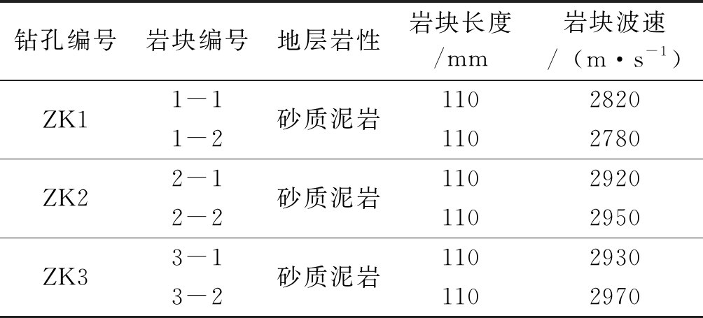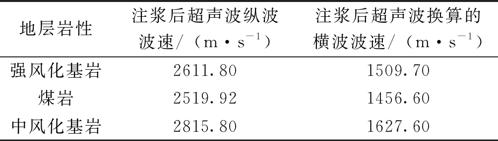 地层岩性注浆后超声波纵波波速/(m·s-1)注浆后超声波换算的横波波速/(m·s-1)强风化基岩2611.801509.70煤岩2519.921456.60中风化基岩2815.801627.60 通过表2可以看出注浆后强风化基岩层纵波波速为2611.80 m/s、橫波波速为1509.70 m/s,煤岩层纵波波速为2519.92 m/s、横波波速为1456.60 m/s,中风化基岩层纵波波速为2815.80 m/s、横波波速为1627.60 m/s。岩体的横波波速均大于250.00 m/s。 3.3.3 室内岩块穿透声波法 穿透声波的检测目的主要用于了解注浆后岩块的质量,测试结果见表3。 表3 室内岩块穿透声波法试验结果