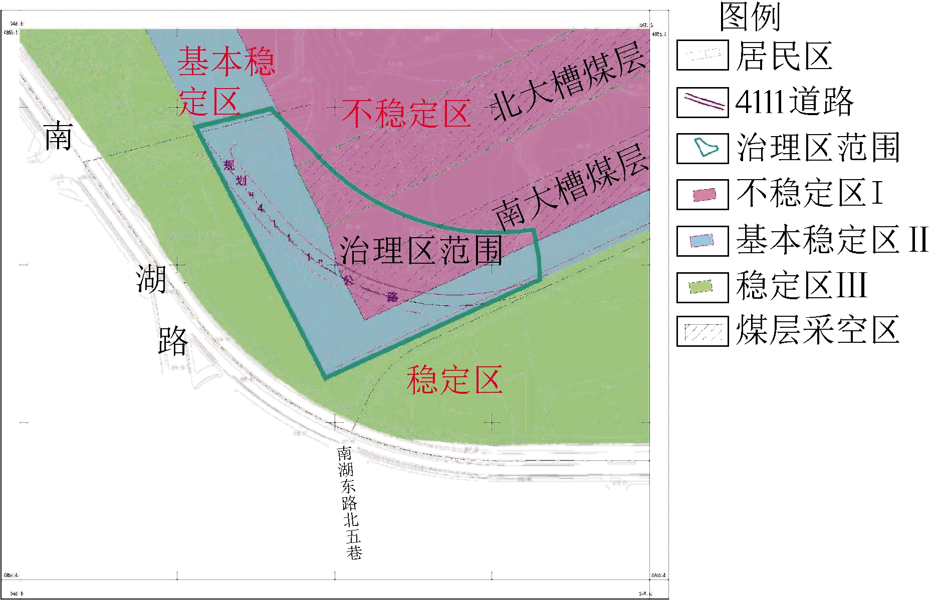 ★ 科技与工程 ★ 六道湾煤矿西翼规划公路下伏采空区治理措施研究乌鲁木齐煤田属于侏罗纪煤田,辖区内煤炭储量达100亿t以上,但是经过半个多世纪的开采,在市区地表形成了约440万m2的地面塌陷,严重影响了市区的生态环境和城市基础建设,同时也制约了城市的整体规划、生态环境和经济发展。 乌鲁木齐市规划4111公路属于城市次干道,长约456 m,规划红线宽度60 m,规划路面宽度24 m。该公路的规划路线位于六道湾煤矿塌陷区西翼西南部,公路西段跨越南大槽煤层的采空区及南大槽和北大槽煤层西侧的影响变形区。煤层开采形成的采空不稳定区及其影响变形下的基本稳定区内的路段,将对4111公路的安全运营带来潜在的威胁,甚至可能引发重大地质灾害。 专家和学者针对煤层开采厚度大、埋深浅以及急倾斜等特点煤层采空区的治理措施进行了一定程度的理论分析和工程实践,取得了较好的治理效果。付小铜[1]、刘博文[2]基于物探手段探明了采空区的分布范围和高度,为采空区的治理提供了基础依据;付小铜[1]、刘庆顺[3]、吴志臣[4]等采用压力注浆法和多分支孔技术对采空区进行了治理,提高了采空区治理的效果;张志沛[5]、李云龙[6]、郭良春[7]、贺阳阳[8]等针对乌鲁木齐地区急倾斜煤层采空区的稳定性评价和治理措施进行了研究,通过治理提升了上部道路和建筑物的安全性。因此,在对研究区规划道路下伏采空区地质条件分析的基础上,对乌鲁木齐市规划4111公路下伏采空区发育特征、稳定性和治理措施进行评价和分析。通过对乌鲁木齐市规划4111公路下覆采空区的工程治理,可以消除地质灾害隐患对公路的威胁,促进该区的经济发展和社会和谐。 1 研究区地质条件概况1.1 自然地理乌鲁木齐市地处欧亚大陆腹地,属温带大陆性干旱气候。研究区位于乌鲁木齐河与水磨沟河的河间地块上,原为梁状丘陵台地地形,区域总地势南高北低。 1.2 地层岩性研究区位于准南煤田东南部乌鲁木齐市六道湾煤矿西翼,区内均为陆相沉积地层,以中新生界为主,其中以侏罗系分布最广,新生界次之。研究区出露地层除南部的红山背斜有二叠系分布外,在整个塌陷区及其南北广大地区均分布着第四系松散沉积物,下伏地层为侏罗系含煤地层,侏罗系大部分被第四系所覆盖。 1.3 水文地质条件研究区地下水类型除西部靠近乌鲁木齐河床地带分布有松散岩类孔隙水外,其余地区均为碎屑岩类裂隙孔隙水。地下水主要接受南侧和西南、东南侧侧向地下径流补给,遇强降雨天气时还接受少量降水入渗补给;在松散岩类孔隙和碎屑岩类裂隙中大体由南向北径流;至矿区北界处大部分以地下径流方式向北排泄到邻区,一部分排入六道湾煤矿的矿区排水系统,最终排出地表。主要含水岩层及其富水性如下所述。 (1)第四系砂卵砾石孔隙含水层。主要分布于外环路以西地区,含水层岩性为砂卵砾石,厚度2~5 m。地下水埋深在5~16 m之间,外环路与南湖路交界处东南部和以北受六道湾西翼采煤的影响,野外调查期间研究区此层不含水。 (2)侏罗系砂岩裂隙孔隙含水层。分布于整个研究区,在西部与上覆砂卵砾石孔隙含水层连成一体,中间没有隔水层。含水层岩性主要为煤层顶底板砂岩和粉砂岩,局部夹有薄层砾岩。煤层开采前,由于煤层和所夹的炭质泥岩起相对隔水作用,煤层顶底板含水层互不连通或连通微弱。煤层开采后,所有含水层均连为一体,地下水位埋深与上覆第四系砂卵砾石孔隙含水层相一致。 1.4 工程地质条件研究区分布的工程地质岩组和岩土体包括4种类型。 (1)中厚层状较坚硬砂岩、粉砂岩岩组。该岩组岩性主要为侏罗系中侏罗统西山窑组砂岩和粉砂岩,其上在头屯河组中下部夹有少量薄层砾岩。砂岩和砾岩较坚硬,抗风化性较强,力学强度较大;粉砂岩尤其是泥质或炭质粉砂岩相对较软弱,抗风化性较差,力学强度相对较小,粉砂岩天然抗压强度为14.6~70.6 MPa,饱和抗压强度为3.08~37.40 MPa,软化系数为0.15~0.84。 (2)中厚层及薄层炭质泥岩与煤层互层岩组。该岩组岩性为侏罗系中侏罗统西山窑组炭质或泥质粉砂岩、碳质泥岩夹煤层,质地软弱,抗风化性差,炭质泥岩风化后极易崩解成小碎块,力学强度小,天然抗压强度为10.9~90.1 MPa,饱和抗压强度为1.5~28.4 MPa,软化系数为0.09~0.32。 (3)粉土、砂砾石双层土体。该岩土体分布于研究区周边地区,不整合覆盖在上述侏罗系岩组之上。组成岩性上部为粉土,下部为圆砾,局部夹有粉质粘土,岩组总厚度一般为10~20 m,厚者可达30 m左右。结构松散,无湿陷性。 (4)人工填土。杂色、松散,主要成分为建筑垃圾、粘性土、粉煤灰及少量生活垃圾等。 2 研究区下伏采空区稳定性分区研究区存在的主要地质环境问题是地面塌陷,六道湾南大槽和北大槽煤层2个塌陷带在20世纪70年代已基本形成。南大槽煤层塌陷带宽度为35~50 m,塌陷变形带宽度达70~80 m,塌陷区面积约5.6万m2;北大槽煤层塌陷带宽度为40~60 m,塌陷变形带宽度达100 m以上,塌陷区面积约7万 m2。除南大槽和北大槽煤层外,在北大槽煤层以北的2组近距离煤层群分布区,还发育有众多成带状延续的塌陷坑,近似呈圆形,直径一般在30~50 m,深度20~40 m不等,部分地段塌陷坑贯通成不连续的槽形,现已回填。 根据研究区塌陷体稳定性评价以及六道湾煤矿移动盆地岩层影响角建议值,将研究区划分为稳定区、基本稳定区、不稳定区3个区,