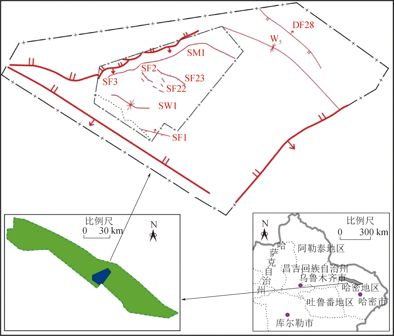 ★ 生产开发 ★ 石头梅露天矿资源特征及绿色开发构想三塘湖煤田位于新疆东北部巴里坤县,是国家西部大开发计划所确定的全国最大的整装煤田勘查区,浅层(埋深1 000 m以浅)煤炭储量约为514.44×108 t,深部(埋深2 000 m以浅)资源量达1 200×108 t[1],是新兴能源基地和“疆煤外运、疆电外输”战略的保障[2-4]。石头梅矿区位于三塘湖煤田中部偏南(92°55′57″~ 93°12′40″E,44°26′28″~44°35′07″N),东西长20.5 km,南北宽9.8 km,面积约194.67 km2,是新疆能源集团主要矿权区[5-6]。 1 矿区概况石头梅矿区位于巴里坤北部的荒漠戈壁,构造属三塘湖盆地石头梅凸起,南依钦莫乌拉山,地势向北倾斜。盆地地形平坦,海拔最高点860 m,最低700 m,地表风化严重,被第四系砾石、砂土覆盖。由于深居大陆腹地,远离深海大洋,终年干旱,降水稀少,年均降水不足200 mm,蒸发量则高达2 000 mm。地面干涸,植被稀疏。风能资源异常丰富,大风(七级以上)天数年均约120 d;日照充足,年均日照时数2 858.0~3 373.4 h,是国内光能资源丰富地区之一,太阳辐射年均在613.2~661.4 kJ/cm2。 为实现新疆优势资源转化,加快三塘湖煤田的开发建设,高等级的矿区公路已修建完工,作为“疆煤外运”今后主要通道的北翼铁路已完成立项;“疆电外输”规划通道三塘湖-哈密-重庆的±800 kV特高压直流输电工程也已立项建设。 1.1 矿区构造石头梅露天矿构造上位于三塘湖盆地东南部凸起部位,西侧为汉水泉凹陷,东侧为条湖2个凹陷[4]。边界断裂由西南方的白衣山逆断裂(∠70°,L=104 km),东南方的疙瘩弯逆断裂(∠65°,L=12.5 km)以及北部的沙河坝逆断裂(∠55°,L=8.9 km)所控制。矿区内主要断层为SF3(逆断层,NE向),还发育SF1、SF2、DF23等北西向小型逆断层,北为SM1背斜、南为SW1向斜,如图1所示。