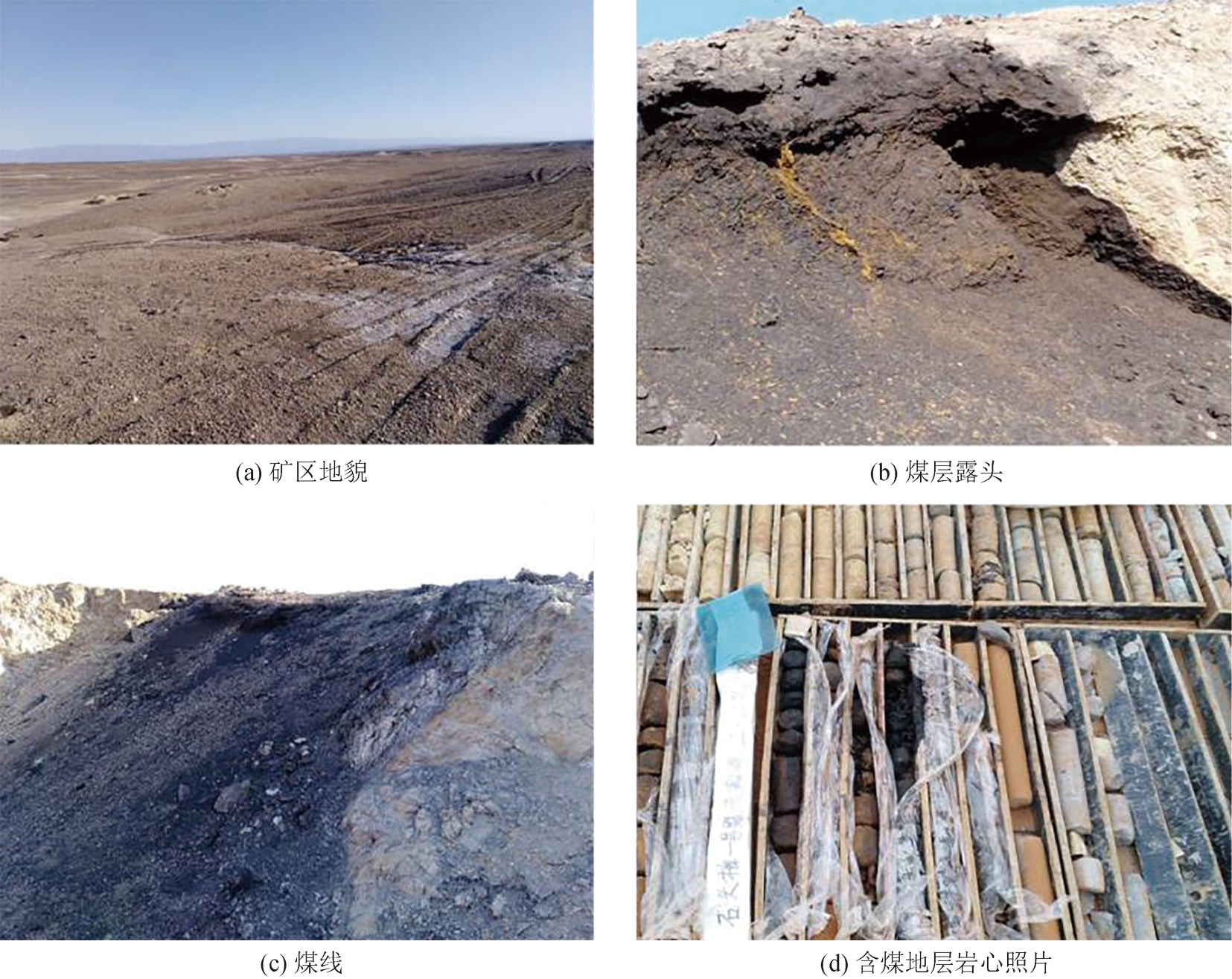 图1 矿区位置及地质简图 1.2 矿区地层古生代、中生代和新生代陆相沉积构成矿区主要地层,可划分为石炭系(C)、二叠系(P)、侏罗系(J)、新近系(N)和第四系(Q)。煤系地层为中侏罗统西山窑组(J2x),属湖沼相沉积,盆地内广泛分布,岩性以石英长石砂岩、粉砂岩和泥岩为主。含煤地层总厚度约350~1 000 m,由边缘向沉降中心增厚。矿区内西山窑组可分为3段:下段(J2x1)以煤和深色不同粒级的砂岩为主,可见植物化石碎片,为主要储层(共9层煤),厚度约300~550 m;中段(J2x2)以浅色石英长石砂岩(中细粒级)为主,含亮煤透镜体,厚度约200 m;上段(J2x 3)以灰绿色、浅灰色石英长石粉砂岩为主,夹厚层砂砾岩,含硅化木,厚度约180 m。 新近系(N)为强氧化湖相沉积,以红色砾岩、砂泥岩为主,超覆于侏罗系之上,上被第四系覆盖;第四系(Q)为冲积、洪积层(Q3pl、Q4pl),大面积覆盖,由砾石层、亚砂土组成,呈未胶结-半胶结状。砾石直径10~20 mm,偶见150~200 mm,圆度差异不大,成分随基岩岩性而变化。由于局部地表强烈剥蚀,野外可见煤层露头及煤线,如图2所示。