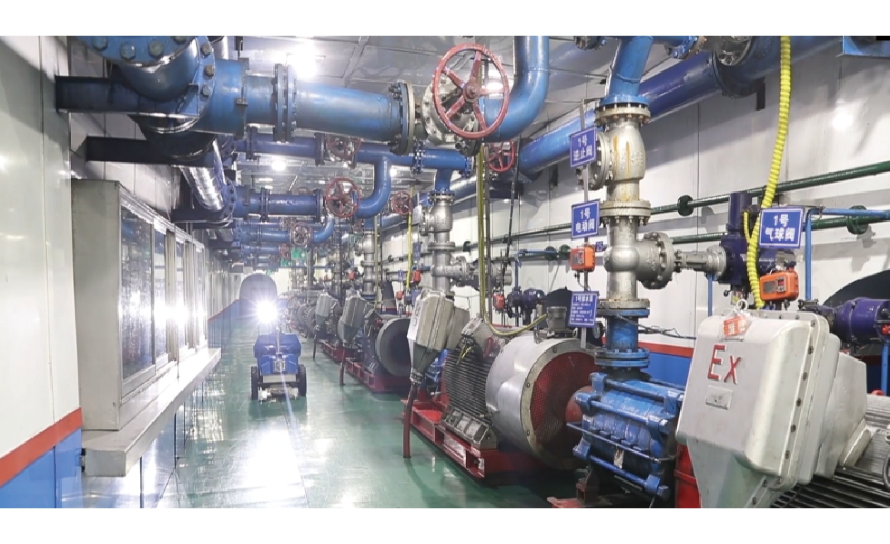 图3 变电所轨道巡检机器人 (2)供排水系统。在水泵房引进智能轮式巡检机器人,如图4所示,实现水泵房无人值守,提升泵房运行可靠性。在井下泵房、盘区、巷道口管道安装压力、流量和水质监测传感器,巷道低洼处安装水位传感器,中转水仓全部实现自动排水,并将全部数据接入自动化系统实时监测。