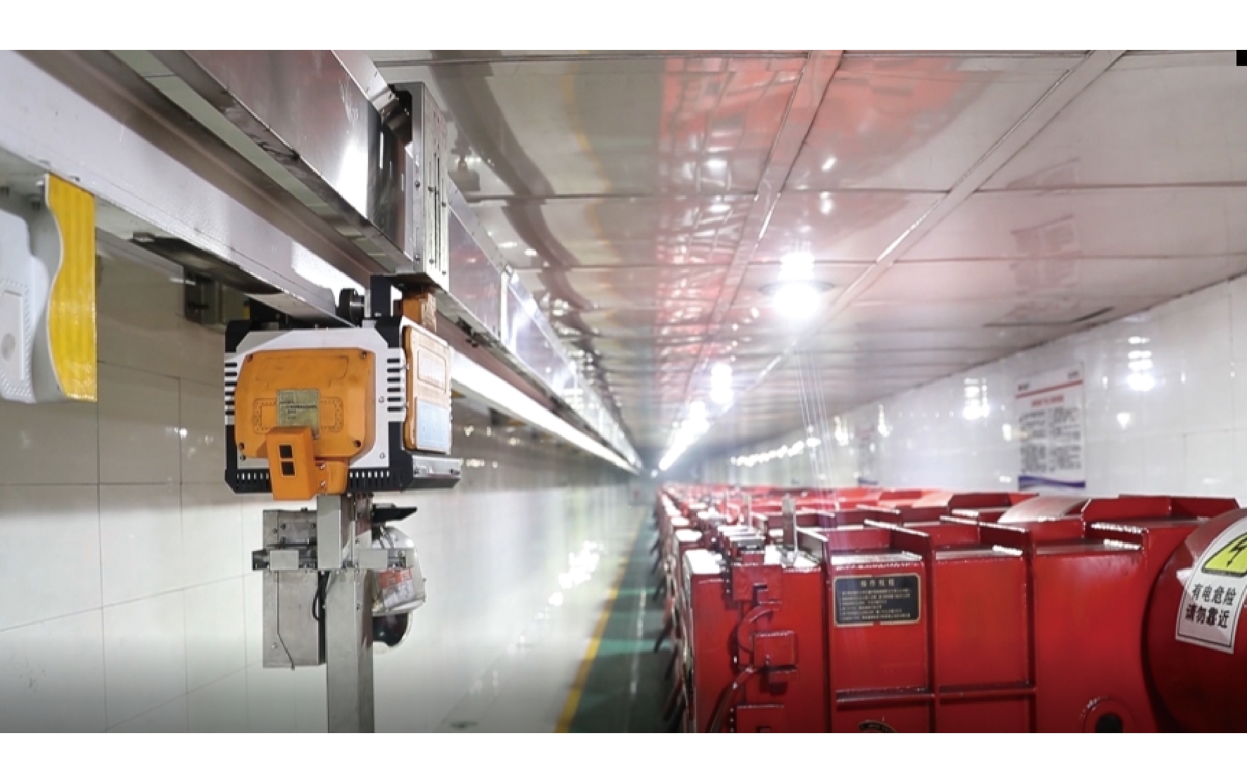 图2 连采机智能化开采方案 2.2.3 机电智能化 (1)供电系统。变电所全部实现无人值守,对井下中央变电所非防爆柜进行自动化改造,完善各变电所低压系统自动化控制,保证变电所高低压设备实现远程控制。在变电所引进轨道巡检机器人进行智能巡检,如图3所示,实施防越级跳闸项目,保障变电所可靠供电。井下固定的配电点移动变压器、馈电开关、照明信号综合保护装置要求全部配置智能设备,并实现自动化控制。