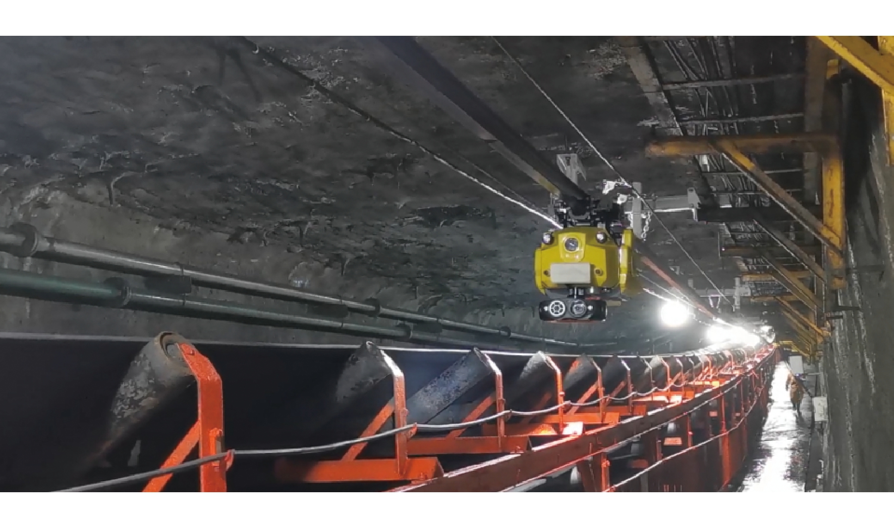 图4 水泵房智能轮式巡检机器人 2.2.4 运输智能化 (1)装备改造提升。将主运输带式输送机托辊批量更换为不锈钢托辊,寿命可达50 000 h,损坏率小于10%。将滚筒更换为高分子材料包胶滚筒,寿命可达50 000 h。胶带面更换为防纵撕芳纶带面,紧急情况下,可通过胶带卡扣接带。将现有主运输电机、减速箱、轴承进行更换,连续运行20 000 h免维护。将配仓带式输送机更换为三相永磁同步电动滚筒,功率可达400 kW。巷道带式输送机可更换500~1 000 kW永磁同步电动机,寿命可达30 000 h以上,将电机与滚筒融为一体,抛弃了减速器、液力耦合器和联轴器等机械装置,负载率在25%~120%范围内,电机均能保证较高的效率。联轴器更换为蛇形弹簧联轴器,20 000 h免维护,并加装监测设备。对带式输送机搭接点处漏煤斗进行改造,采用工厂标准件加工方式,可减少大块煤对带面的冲击,并具有耐磨、防止撕带等功能。 (2)智能化建设。主运系统带式输送机全部实现无人值守和智能调速,系统实现一键启停功能[13]。在主运带式输送机引进巡检机器人,具有环境气体监测与报警功能,可自动识别设备的表面温度以及起火、起烟、跑偏、异常声音等故障状态。引进托辊发电装置,可为带式输送机机头、中驱监测设备提供电源和照明。引进带式输送机钢丝带面监测系统,可实时监测带面钢丝的运行状态,发现异常,可提前进行更换,预防断带等事故。引进带式输送机温度及振动在线监测系统,可实时监测带式输送机滚筒和减速机轴承温度、电机绕组温度、减速机油温。对现有纵撕传感器技术升级,尽量降低无人值守带式输送机撕带事故扩大。引进带式输送机智能管理系统,将主运带式输送机各分散系统进行融合,形成一套带式输送机智能化控制与管理系统。建立手持式智能监控终端,方便巡检人员及时查看无人值守带式输送机的运行状态。带式输送机钢丝绳牵引式巡检机器人如图5所示