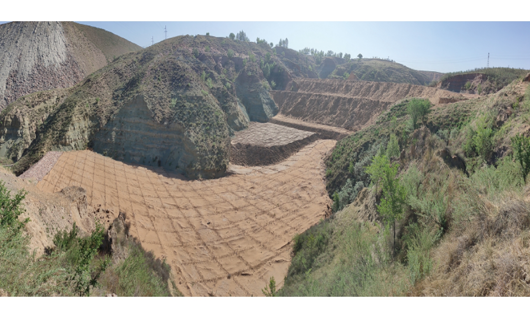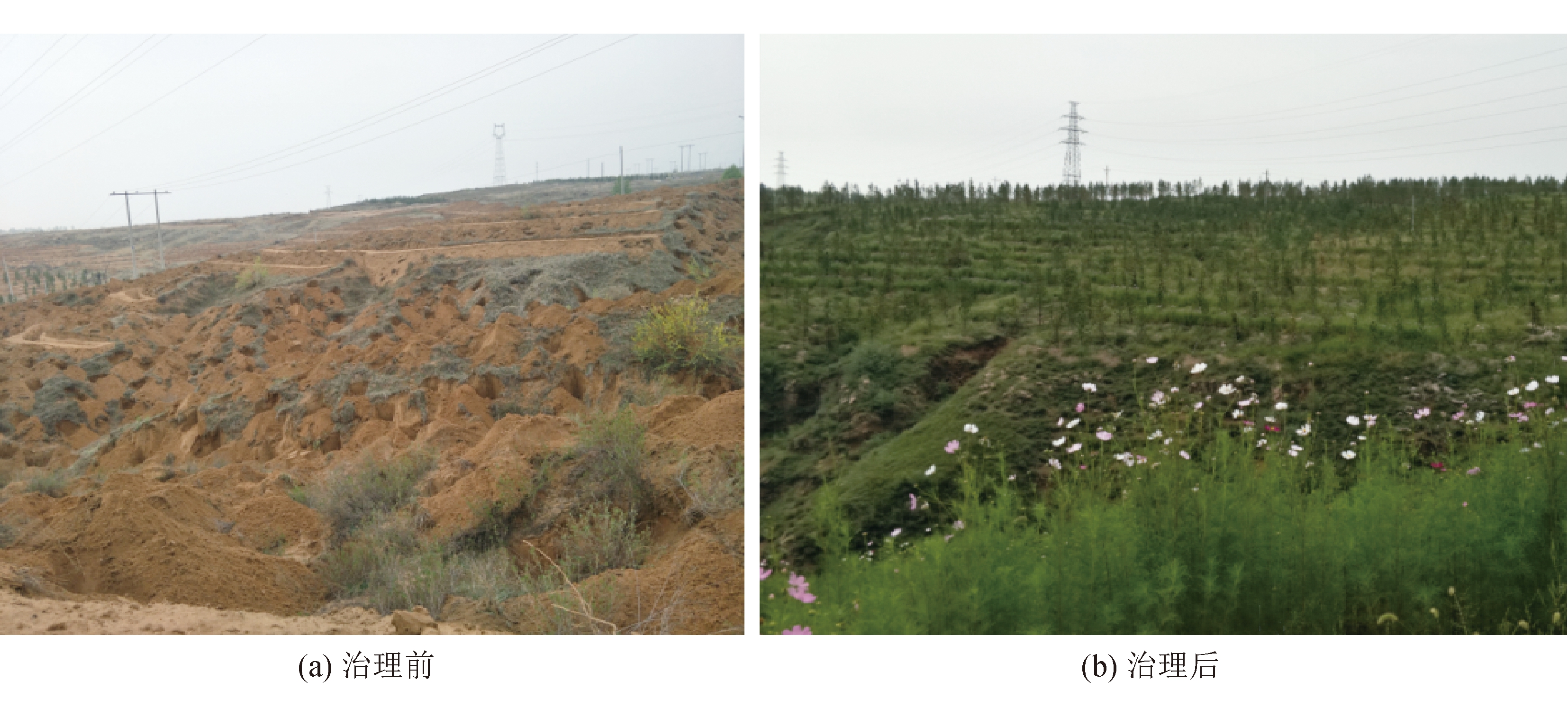 图7 煤矸石排放治理效果 2.3.3 地表生态综合治理 采后生态系统修复,坚持开发与治理并重的方针,采用“三期三圈”环境治理和生态再造模式,严格执行“环境影响评价”“三同时”制度及环境恢复治理保证金制度,吨煤提取0.45元/t费用用于环境治理,经过几十年的投资和治理,当前治理面积达到29 km2,矿区植被覆盖率由开发初期的11%提高到65%以上[18-19],地表生态综合治理前后对比如图8所示。