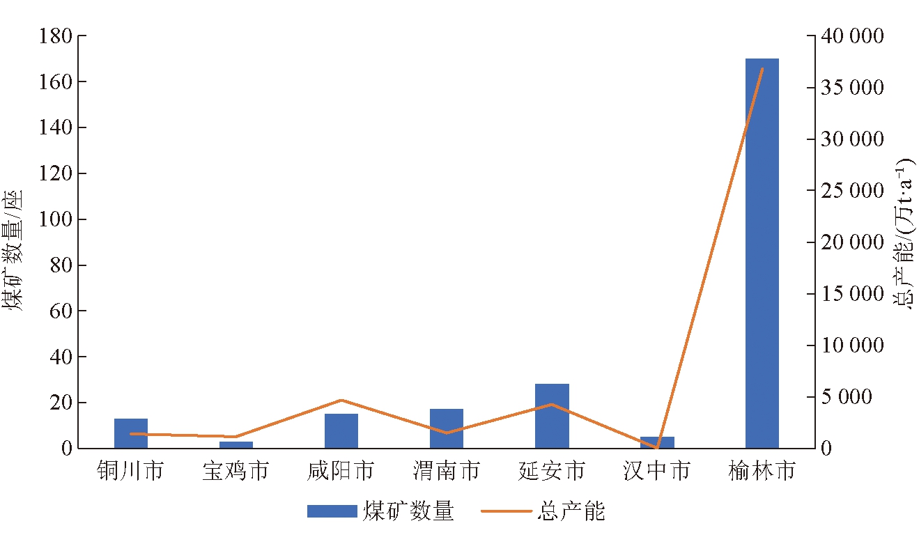 图1 陕西省煤炭资源分布 渭河以北五大煤田煤类由低变质长焰煤到高变质无烟煤均有分布,其中侏罗纪煤田以低变质长馅煤、不粘煤为主,陕北三叠纪煤田以中变质气肥煤为主,渭北石炭-二叠纪煤田为高变质的瘦煤至无烟煤,陕北石炭-二叠纪煤田以低变质长焰煤、不粘煤与中变质焦煤均有分布。 2 陕西省煤炭资源勘查开发现状分析2.1 煤炭资源勘查现状根据《全国煤炭资源潜力评价》和最新统计数据显示,陕西省累计探获煤炭资源量中尚未利用资源量为1 815.65 亿t,按勘查程度划分:勘探资源量为606.51 亿t,占总量的18.54%;详查资源量为316.52 亿t,占总量的17.10%;普查资源量为426.92 亿t,占总量的23.06%;预查资源量为764.77 亿t,占总量的41.31%。从陕西省当前勘查程度来看,普查和预查阶段的资源量在探获的资源量中所占比重约为64.37%,说明陕西省煤炭资源勘查程度偏低,需要进一步提高煤炭资源勘查程度,为大型煤炭基地矿区规划和新井建设提供煤炭资源保障 [9]。 2.2 煤炭资源开发现状根据国家能源局公告,截至2019年底,陕西省共有生产煤矿251座,合计产能49 863 万t/a。小型煤矿47座,合计产能1 305 万t/a,占煤矿产能总数的2.62%;中型煤矿105座,合计产能7 053 万t/a,占煤矿产能总数的14.14%;大型煤矿99座,合计产能41 505万t/a,占煤矿产能总数的83.24%。说明陕西省当前煤矿以大型煤矿为主,其中榆林市煤矿数量最多,达到170座,占总数的67.73%,总产能为36 800 万t/a,占全省总产能的73.80%。陕西省煤矿数量及产能分布情况如图2所示。