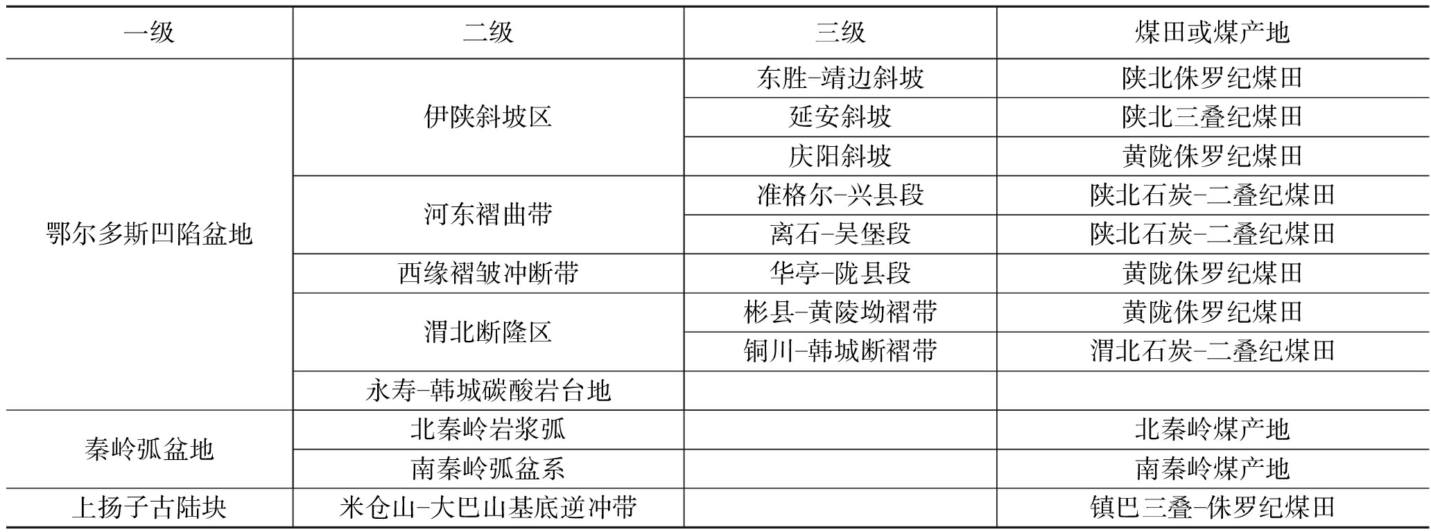 ★ 生产开发 ★ 新时期陕西省煤炭资源勘查开发布局研究0 引言煤炭作为我国的基础能源和工业原料,长期以来为经济社会发展和国家能源安全稳定供应提供了有力保障。根据地质勘查成果分析,我国能源资源禀赋特点为“相对富煤、缺油、少气、缺铀”,这就决定了煤炭资源作为我国最主要的基础性能源消费地位短时间内难以改变[1-4]。随着煤炭生产开发布局战略西移的加速,陕西省煤炭产业未来发展潜力巨大,本文客观分析了陕西省煤炭资源赋存特点与勘查开发现状,对陕西省未来一段时间煤炭勘查开发布局重新进行了审视和优化,为陕西省煤炭产业绿色、清洁、低碳发展提供参考[5]。 1 陕西省煤炭资源分布概况1.1 陕西省赋煤构造及赋煤单元划分根据《陕西省煤炭资源潜力评价》成果,对陕西省赋煤构造单元划分了3个一级赋煤构造单元、8个二级赋煤构造单元、8个三级赋煤构造单元[6],具体见表1。 表1 陕西省赋煤构造单元划分