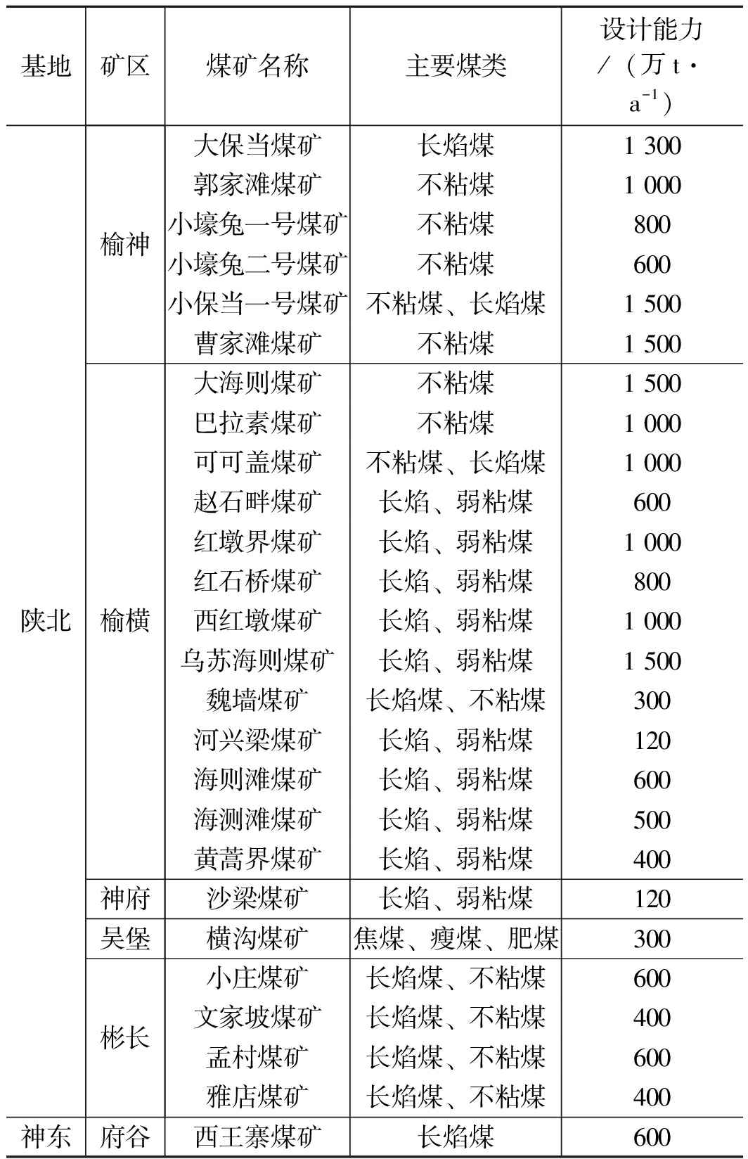 基地矿区煤矿名称主要煤类设计能力/(万t·a-1)陕北榆神榆横神府吴堡彬长大保当煤矿长焰煤1 300郭家滩煤矿不粘煤1 000小壕兔一号煤矿不粘煤800小壕兔二号煤矿不粘煤600小保当一号煤矿不粘煤、长焰煤1 500曹家滩煤矿不粘煤1 500大海则煤矿不粘煤1 500巴拉素煤矿不粘煤1 000可可盖煤矿不粘煤、长焰煤1 000赵石畔煤矿长焰、弱粘煤600红墩界煤矿长焰、弱粘煤1 000红石桥煤矿长焰、弱粘煤800西红墩煤矿长焰、弱粘煤1 000乌苏海则煤矿长焰、弱粘煤1 500魏墙煤矿长焰煤、不粘煤300河兴梁煤矿长焰、弱粘煤120海则滩煤矿长焰、弱粘煤600海测滩煤矿长焰、弱粘煤500黄蒿界煤矿长焰、弱粘煤400沙梁煤矿长焰、弱粘煤120横沟煤矿焦煤、瘦煤、肥煤300小庄煤矿长焰煤、不粘煤600文家坡煤矿长焰煤、不粘煤400孟村煤矿长焰煤、不粘煤600雅店煤矿长焰煤、不粘煤400神东府谷西王寨煤矿长焰煤600 (2)陕西省煤层气资源位列全国第三,预测总量13 866.86 亿m3,主要赋存于渭北-石炭二叠纪煤田、陕北-石炭二叠纪煤田和黄陇侏罗纪煤田,以铜川北区、彬长矿区、吴堡矿区等为重点,开展煤层气抽采技术研究,同时应加强构造煤、低渗煤储层煤层气开发关键技术攻关,加大煤层气勘探开发投资力度,促进陕西省煤层气产业的快速健康发展[15-17]。 4 结论(1)陕西省煤炭资源丰富,累计探获煤炭资源量2 790.45 亿t,其中保有资源量1 995.53 亿t,主要分布在陕北侏罗纪煤田、陕北石炭-二叠纪煤田、陕北三叠纪煤田、黄陇侏罗纪煤田及渭北石炭-二叠纪煤田等五大煤田。 (2)陕西省煤炭资源勘查程度主要以普查和预查工作阶段为主,说明陕西省煤炭资源勘查程度偏低,需要进一步提高煤炭资源勘查程度,为大型煤炭基地矿区规划和新井建设提供煤炭资源保障程度。陕西省当前煤矿以大型煤矿为主,其中榆林市煤矿数量和总产能最多。 (3)根据陕西省煤炭资源禀赋优势,在坚持绿色发展的大背景下,近期煤炭勘查开发布局主要围绕陕北、神东、黄陇3个大型煤炭基地进行,勘查方面主要是提高大型煤炭基地详查、勘探资源的比重,同时推进煤层气和煤系伴生资源的勘查;开发方面结合陕北、黄陇、神东3个大型煤炭生产基地建设实际与开发强度,进一步优化开发布局,同时加大低阶煤储层煤层气开发力度。 [1] 王双明,段中会,马丽,等.西部煤炭绿色开发地质保障技术研究现状与发展趋势[J].煤炭科学技术,2019,47(2):1-6. [2] 赵开功,李彦平.我国煤炭资源安全现状分析及发展研究[J].煤炭工程,2018,50(10):185-189. [3] 郑德志,吴立新.新时期我国煤炭供给面临的新问题及对策建议[J].煤炭经济研究,2019,39(6):79-84. [4] 滕吉文,乔勇虎,宋鹏汉.我国煤炭需求、探查潜力与高效利用分析[J].地球物理学报,2016,59(12):4633-4653. [5] 朱吉茂,李瑞峰,王雷.我国西北煤炭发展空间和布局研究[J].中国矿业,2019,28(1):41-46. [6] 王双明.鄂尔多斯盆地聚煤规律及煤炭资源评价[M].北京:煤炭工业出版社.1996. [7] 贾志刚,胡勇.陕西省煤炭资源分布与潜力评价研究[J].陕西煤炭,2009,28(2):38-39. [8] 卢新卫.陕西各成煤期煤中硒的含量赋存特征及环境效应研究[J].干旱区资源与环境,2004,18(2):27-31. [9] 王元,李成伟,张舜尧.陕西省煤炭资源勘查及开发程度分析[J].科技创新与应用,2017(26):170,172. [10] 李惠云.新时代我国煤炭行业高质量发展路径探讨[J].中国煤炭,2019,45(10):22-26. [11] 李绪国.我国煤炭资源安全高效绿色开发现状与思路[J].煤炭科学技术,2013,41(8):53-57,73. [12] 李霞,崔涛.我国煤炭资源可持续发展的保障分析[J].中国煤炭,2019,45(1):33-37. [13] 蔺亚兵,段中会,王兴,等.陕西省煤层气资源勘查开发现状及建议[J].中国煤炭地质,2016,28(12):34-37. [14] 魏云迅,姜波,孙顺新,等.陕西凤县煤系石墨矿床构造特征及找矿预测[J].中国煤炭地质,2017,29(3):1-4,36. [15] 张玉平.陕西渭北、陕北石炭二叠纪煤系共伴生高岭岩赋存规律及利用方向[J].中国煤田地质,2007(1):22-25,41. [16] 郭建南.陕西省“十四五”煤炭矿区开发潜力分析[J].能源与节能,2020(8):33-34. [17] 刘晓东.陕北侏罗纪煤田煤炭资源勘查利用现状分析[J].地下水,2017,39(5):126-128. [18] 王波.关于“十三五”陕西煤炭工业发展的思考[J].陕西煤炭,2015,34(1):150-152. [19] 申小龙,蔺亚兵,刘军,等.黄陇煤田低阶煤层气高渗富集区优选预测及开发建议[J].中国煤炭地质,2020,32(11):21-25. [20] 张旭峰.陕西彬长矿区低阶煤地面煤层气开发方式[J].资源与产业,2018,20(1):34-38. Study on the layout of coal resources exploration and development in Shaanxi in the new Era