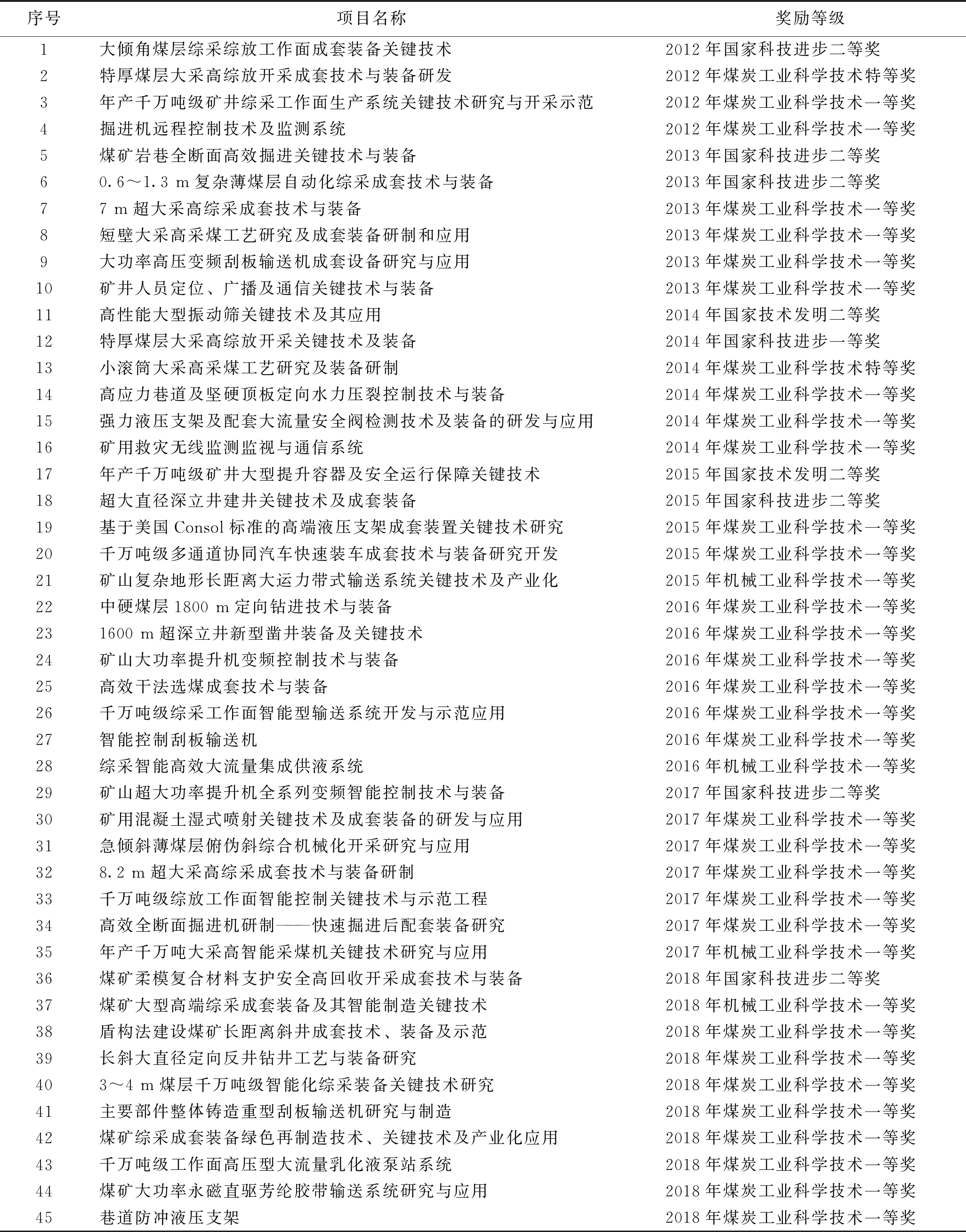 序号项目名称奖励等级1大倾角煤层综采综放工作面成套装备关键技术2012年国家科技进步二等奖2特厚煤层大采高综放开采成套技术与装备研发2012年煤炭工业科学技术特等奖3年产千万吨级矿井综采工作面生产系统关键技术研究与开采示范2012年煤炭工业科学技术一等奖4掘进机远程控制技术及监测系统2012年煤炭工业科学技术一等奖5煤矿岩巷全断面高效掘进关键技术与装备2013年国家科技进步二等奖60.6~1.3 m复杂薄煤层自动化综采成套技术与装备2013年国家科技进步二等奖77 m超大采高综采成套技术与装备2013年煤炭工业科学技术一等奖8短壁大采高采煤工艺研究及成套装备研制和应用2013年煤炭工业科学技术一等奖9大功率高压变频刮板输送机成套设备研究与应用2013年煤炭工业科学技术一等奖10矿井人员定位、广播及通信关键技术与装备2013年煤炭工业科学技术一等奖11高性能大型振动筛关键技术及其应用2014年国家技术发明二等奖12特厚煤层大采高综放开采关键技术及装备2014年国家科技进步一等奖13小滚筒大采高采煤工艺研究及装备研制2014年煤炭工业科学技术特等奖14高应力巷道及坚硬顶板定向水力压裂控制技术与装备2014年煤炭工业科学技术一等奖15强力液压支架及配套大流量安全阀检测技术及装备的研发与应用2014年煤炭工业科学技术一等奖16矿用救灾无线监测监视与通信系统2014年煤炭工业科学技术一等奖17年产千万吨级矿井大型提升容器及安全运行保障关键技术2015年国家技术发明二等奖18超大直径深立井建井关键技术及成套装备2015年国家科技进步二等奖19基于美国Consol标准的高端液压支架成套装置关键技术研究2015年煤炭工业科学技术一等奖20千万吨级多通道协同汽车快速装车成套技术与装备研究开发2015年煤炭工业科学技术一等奖21矿山复杂地形长距离大运力带式输送系统关键技术及产业化2015年机械工业科学技术一等奖22中硬煤层1800 m定向钻进技术与装备2016年煤炭工业科学技术一等奖231600 m超深立井新型凿井装备及关键技术2016年煤炭工业科学技术一等奖24矿山大功率提升机变频控制技术与装备2016年煤炭工业科学技术一等奖25高效干法选煤成套技术与装备2016年煤炭工业科学技术一等奖26千万吨级综采工作面智能型输送系统开发与示范应用2016年煤炭工业科学技术一等奖27智能控制刮板输送机2016年煤炭工业科学技术一等奖28综采智能高效大流量集成供液系统2016年机械工业科学技术一等奖29矿山超大功率提升机全系列变频智能控制技术与装备2017年国家科技进步二等奖30矿用混凝土湿式喷射关键技术及成套装备的研发与应用2017年煤炭工业科学技术一等奖31急倾斜薄煤层俯伪斜综合机械化开采研究与应用2017年煤炭工业科学技术一等奖328.2 m超大采高综采成套技术与装备研制2017年煤炭工业科学技术一等奖33千万吨级综放工作面智能控制关键技术与示范工程2017年煤炭工业科学技术一等奖34高效全断面掘进机研制———快速掘进后配套装备研究2017年煤炭工业科学技术一等奖35年产千万吨大采高智能采煤机关键技术研究与应用2017年机械工业科学技术一等奖36煤矿柔模复合材料支护安全高回收开采成套技术与装备2018年国家科技进步二等奖37煤矿大型高端综采成套装备及其智能制造关键技术2018年机械工业科学技术一等奖38盾构法建设煤矿长距离斜井成套技术、装备及示范2018年煤炭工业科学技术一等奖39长斜大直径定向反井钻井工艺与装备研究2018年煤炭工业科学技术一等奖403~4 m煤层千万吨级智能化综采装备关键技术研究2018年煤炭工业科学技术一等奖41主要部件整体铸造重型刮板输送机研究与制造2018年煤炭工业科学技术一等奖42煤矿综采成套装备绿色再制造技术、关键技术及产业化应用2018年煤炭工业科学技术一等奖43千万吨级工作面高压型大流量乳化液泵站系统2018年煤炭工业科学技术一等奖44煤矿大功率永磁直驱芳纶胶带输送系统研究与应用2018年煤炭工业科学技术一等奖45巷道防冲液压支架2018年煤炭工业科学技术一等奖 3.2.2 掘进机 目前,我国掘进机已形成年产2000余台的加工制造能力,截割功率30~418 kW的全系列产品,基本满足了国内煤炭市场需求,结束了我国煤矿掘进机依靠进口的局面,极大地提高了煤矿掘进机械化程度。从生产企业看,我国可以生产掘进机的企业约有85家,其中,约80家企业以生产各类悬臂式掘进机为主,其余为生产全断面掘进机、掘锚机以及连采机的企业。三一重装研制的双截头EBH418悬臂式掘进机截割高度3.8~5.5 m,截割宽度4.8~8 m,最大截割硬度可达到f12。2019年,中国铁建重工集团自主研制ZJM4200护盾式掘锚机,是我国首台(套)实现掘进、锚护同步施工作业的煤巷掘锚设备。北方重工集团自主研制的直径6.33 m的煤矿巷道岩巷全断面掘进机“新矿一号”正式下线,重700 t,总功率2500 kW,设计掘进速度可达500~800 m/月。 3.2.3 液压支架 液压支架正逐步向大型化、高端化方向发展,2002年至今,6.2 m、6.3 m、6.5 m、6.8 m、7 m、8 m、8.8 m等大采高支架相继研制成功,其中8.8 m特大采高液压支架创造了目前世界上最大采高8.8 m、最大工作阻力26000 kN和最大支护中心距2.4 m的世界纪录。目前,我国已可以生产0.5~8.8 m采高、最大倾角70°、最大工作阻力26000 kN、寿命试验可达6万次以上的500多种型号的液压支架,具备年产10万架的制造能力
