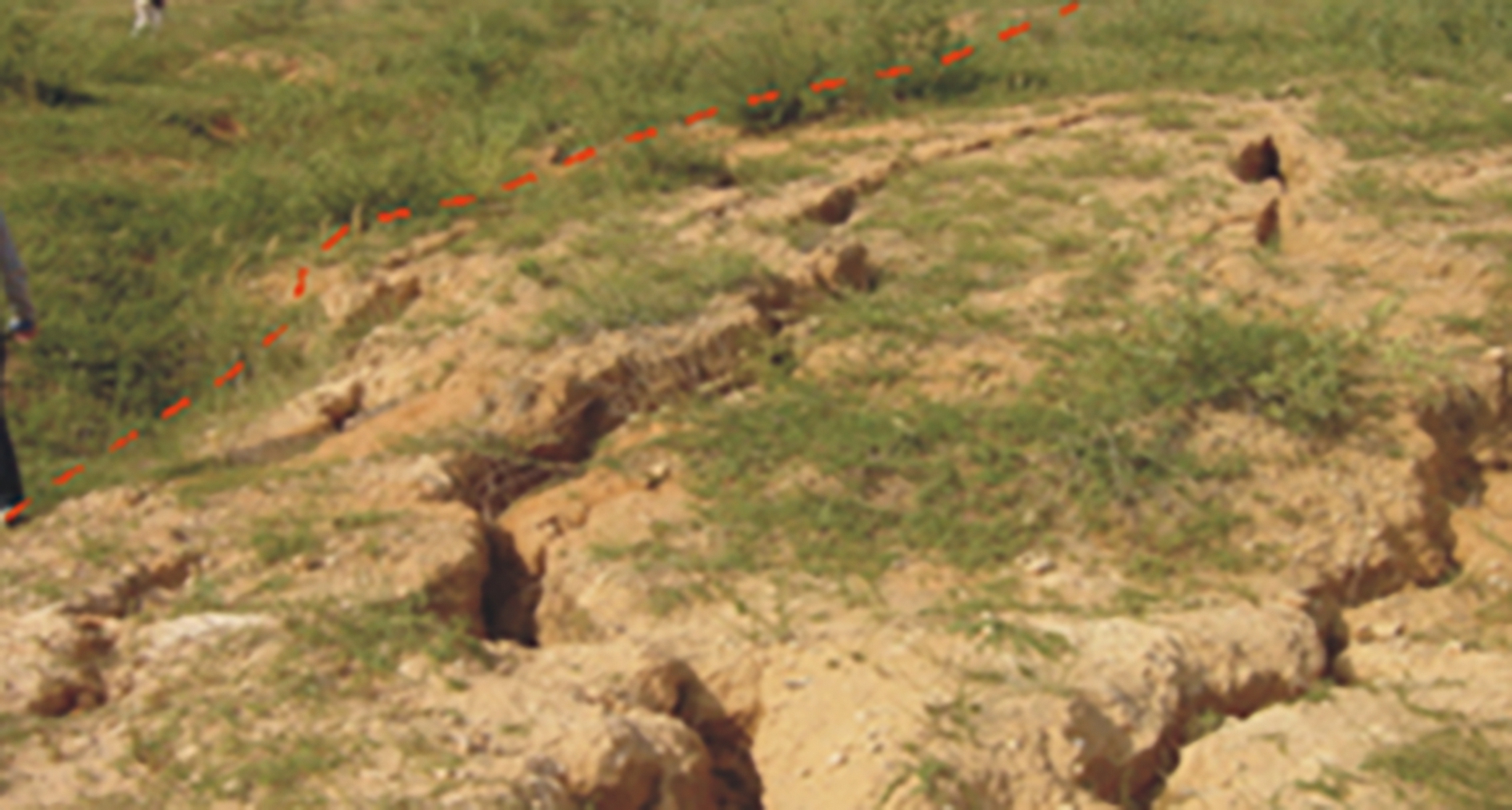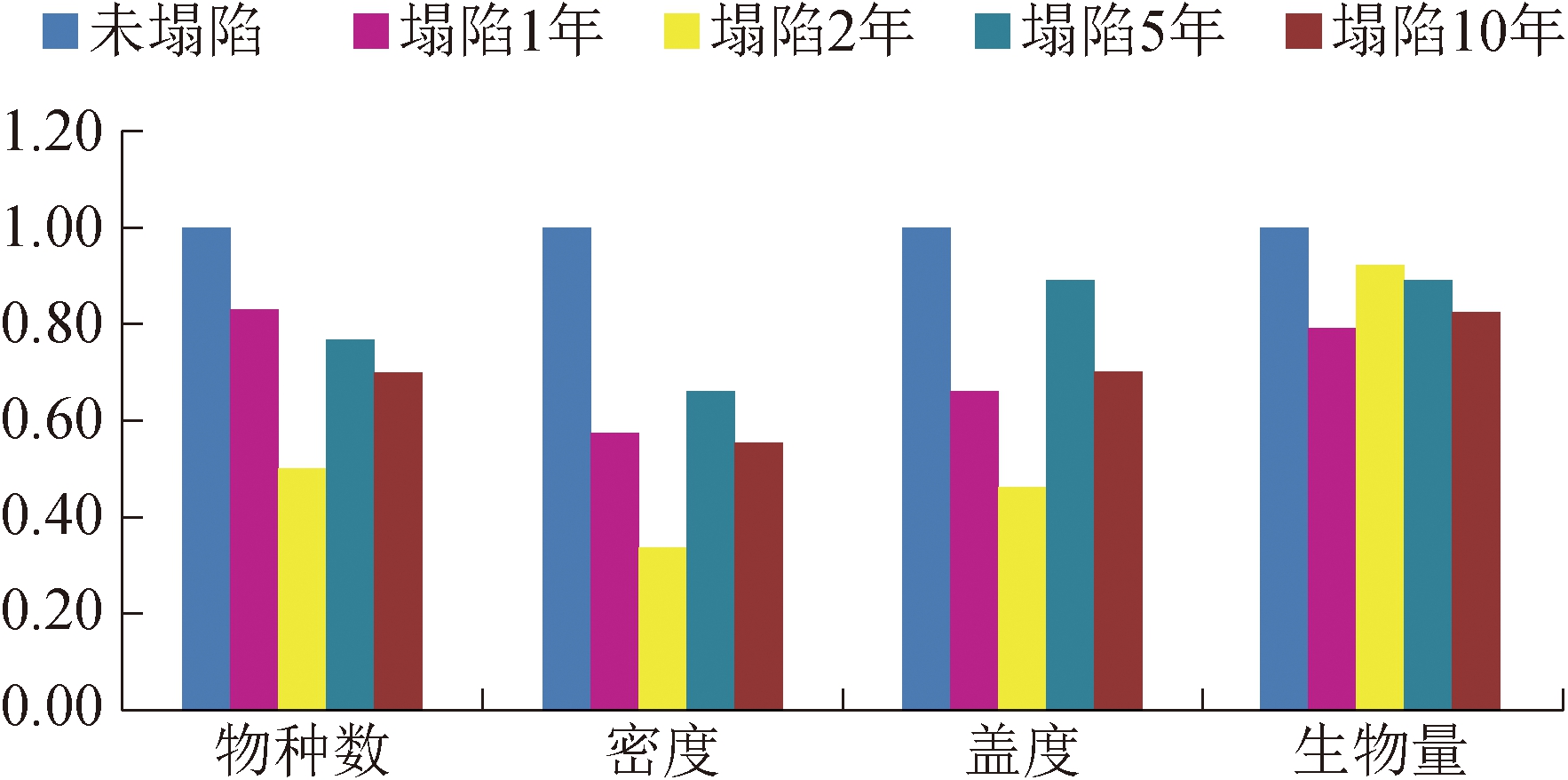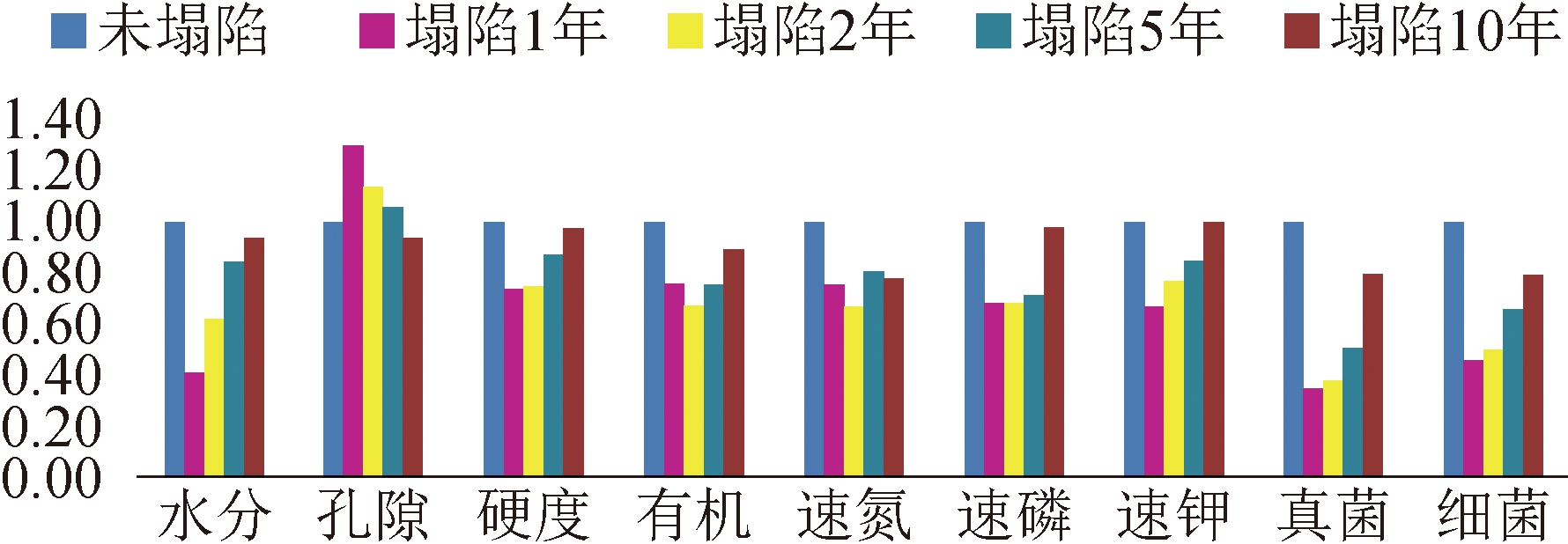 图2 采动损害导致地表植被受损 相关研究表明,西部煤炭开采对地表土壤损害明显,导致塌陷区土壤质量与植被结构退化,虽然随着时间的推移会逐渐恢复,但经过10 a 的自然演替,植物群落结构和土壤质量仍不能恢复至塌陷前的水平。研究结果表明,采煤塌陷区植物群落和土壤因子大体经过3 个不同的演替阶段: 退化期(塌陷后1~2 a) →改善期(塌陷后5 a) →初步恢复期(塌陷后10 a) ; 塌陷地植被与土壤的耦合协调程度在塌陷1 a 表现为轻度失调衰退类植被损益型,塌陷2 a 为濒临失调衰退类植被土壤共损型,塌陷5 a为初级协调发展类植被土壤同步型,至塌陷10 a 仍表现为中级协调发展类植被土壤同步型,但尚未达到未塌陷地良好协调发展的生态类型。地表塌陷前与塌陷后植被与土壤的变化情况如图3和图4所示。
