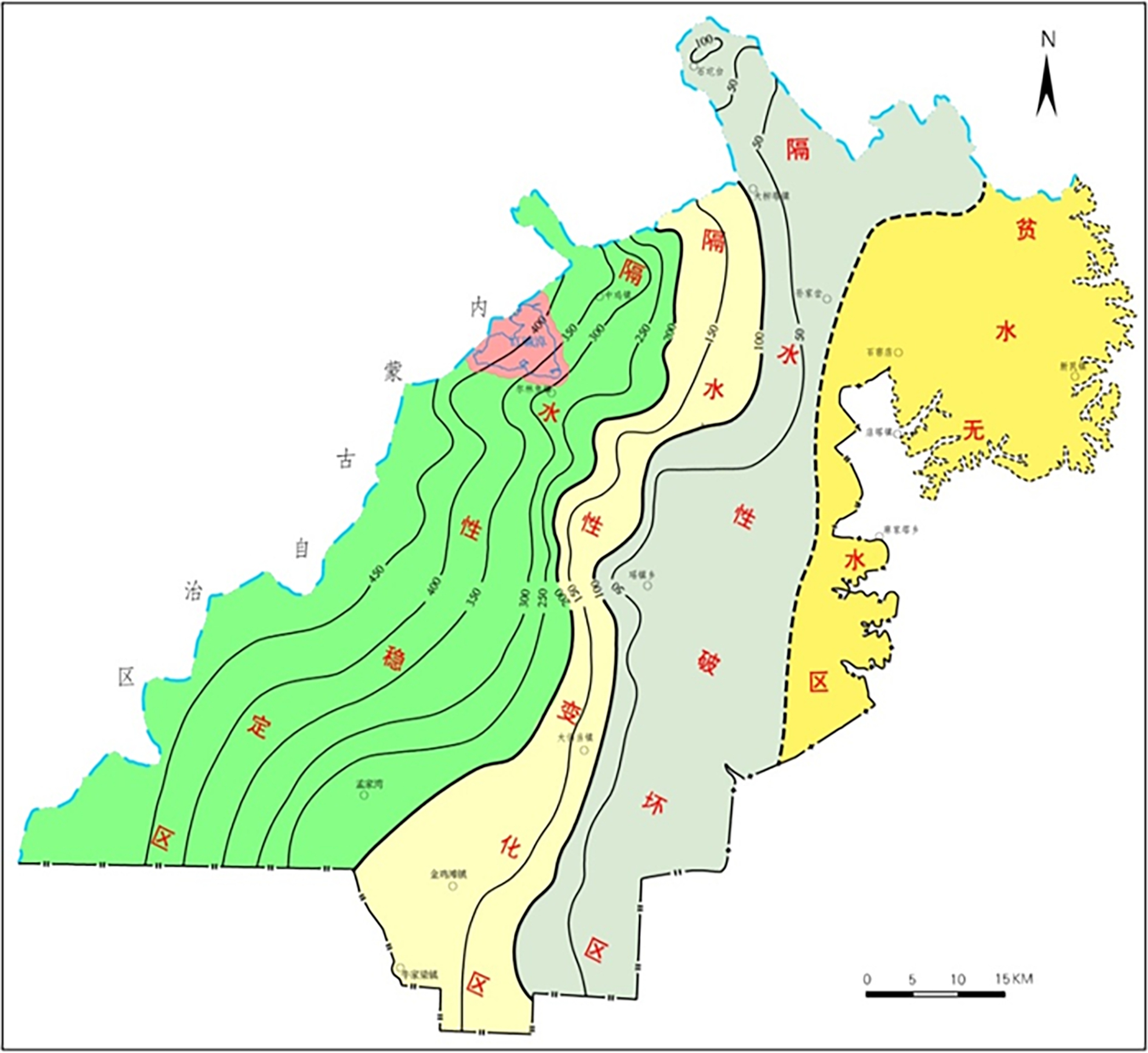 图6 采动隔水性变化示意图 3.4 隔水岩组是生态环境保护的重要地质条件煤层开采后,位于含水层和煤层之间的隔水岩组自下而上产生裂隙,当裂隙切穿隔水岩组时,隔水岩组变成透水岩层,隔水性损坏;当裂隙发育高度小于隔水岩组时,隔水性和含水层保持稳定。煤层上覆隔水岩组岩性、厚度、力学性质以及矿井开采方式、开采高度是影响裂隙发育的主要因素。室内模拟实验和采空区综合探测结果表明,采动裂隙高度约为20~30倍煤层开采高度。隔水岩组厚度大于裂隙发育高度是保护含水层的基本地质条件,提高隔水岩组抗损害能力是减小裂隙发育高度的有效途径。 4 支撑煤炭高质量发展的绿色开采技术促进西部煤炭绿色开采,支撑西部煤炭工业高质量发展,要以煤水空间组合特征研究为基础,以揭示采动地质条件变化规律为途径,以减损地质工程为支撑,以防止隔水岩组破坏为目标,以保护生态水位为核心,实现采煤与生态环境保护协调发展。 4.1 研究煤水空间组合特征煤水空间组合特征研究就是将含水层、隔水层、煤层、地形坡向、地层产状,隔水岩组与岩性结构等作为系统工程进行整体研究。含水层主要研究其分布范围、厚度和富水性变化规律;隔水层不仅要研究土层隔水层分布范围、厚度变化规律,更重要的是要研究隔水岩组总体厚度和岩性组合特点,分析隔水岩组抗扰动能力,预测隔水岩组的隔水性在开采过程的变化,为实施减损地质工程提供依据。 4.2 揭示采动地质条件变化规律采动地质条件变化,特别是隔水岩组的隔水性变化是生态环境保护的关键地质因素。通过室内相似材料模拟、数字模拟和采空区探测工程研究发现,煤炭开采后,煤层和含水层之间隔水岩组的隔水性变化具有分区性。可分为隔水性稳定区、隔水性变化区、隔水性损害区以及贫水或无水区。在隔水性稳定区,隔水岩组厚度大于30倍采高,由于采动损害高度小于隔水岩组厚度,煤炭开采不会对含水层造成损害;在隔水性变化区,隔水岩组厚度为20~30倍采高,煤炭开采对含水层的影响主要取决于煤层采高与隔水岩组岩性组合;在隔水性损害区,隔水岩组厚度小于20倍采高,在综合机械化开采背景下,无论采取何种开采方式,隔水岩组隔水性和含水层都会受到损害;贫水或无水区主要分布在黄土沟壑区,属地表无含水层的水土流失区,保护对象是地表道路和相关设施。采动隔水性变化分区图如图7所示。