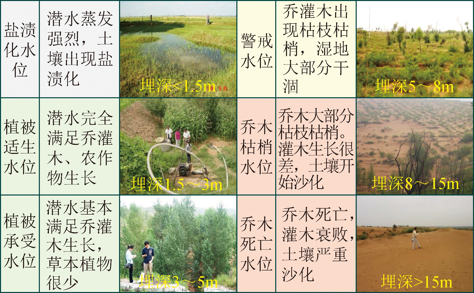图4 地表塌陷前与塌陷后土壤变化情况 3 维系地表生态系统的地质条件与采动损害机理保障国家能源安全必须开发西部煤炭,而煤炭开采必然产生采动损害,因此绿色开采是西部煤炭工业高质量发展必须破解的重大技术难题,也是实现西部煤炭开发与生态环境保护协调发展的重要途径。从2000年开始,陕西煤炭工业局(煤田地质局)、西安科技大学、长安大学、陕西省地质调查院协同攻关,揭示了鄂尔多斯盆地北部生态脆弱矿区环境损害机理,提出了以减少采动损害为途径、以生态水位保护为核心的环境保护理念与技术。 3.1 地表生态与地下水埋深关系密切西部水资源匮乏,地表生态系统与地下水埋深关系密切。其突出特点是,地下水埋藏既不能太深,也不能太浅。根据地下水位埋藏深度,可分为盐渍化水位、植被适生水位、植被承受水位、警戒水位、乔木枯梢水位、乔木死亡水位。当地下水埋深小于1.5 m时,由于蒸发强烈,土壤会出现盐渍化;当地下水埋藏大于15 m时,植被死亡,地表沙化。只有当地下水埋藏在1.5~5 m时,草本植物、农作物、灌木、乔木均能够正常生长,此水位也称为安全生态水位。地表生态与地下水位依存关系如图 5所示。