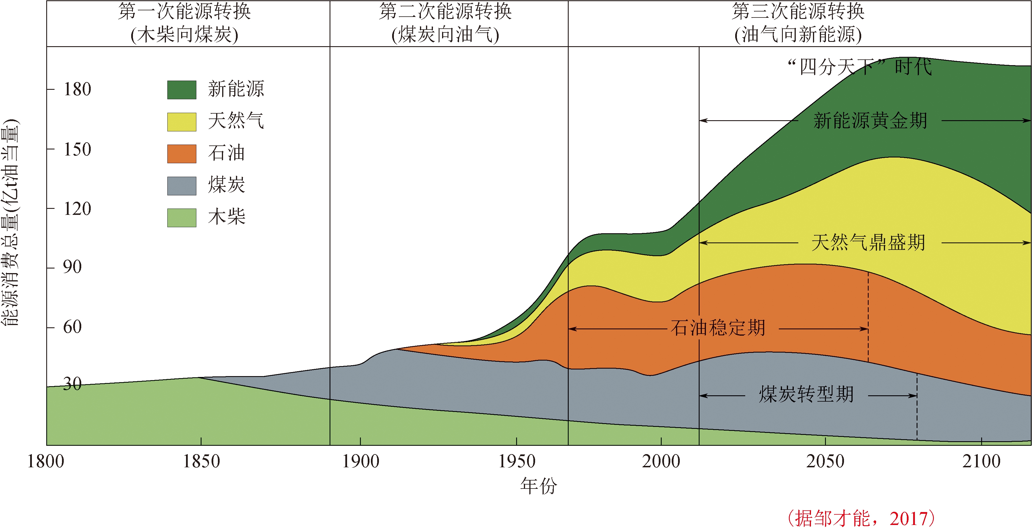 ★ 本刊特稿 ★ 对我国煤炭主体能源地位与绿色开采的思考习近平总书记指出:美国能源发展重点是页岩气,我们对煤的注意力不要分散,关键是解决好煤的清洁高效利用问题。在相当长一段时间内,还是以煤为主的格局;在发展新能源、可再生能源的同时,要做好煤炭这篇文章。我国在着力推动能源革命,加大能源结构调整的进程中,煤炭作为我国主要能源的地位和作用是难以改变的。 缺油、少气、相对富煤是我国能源资源国情,以煤为主的能源消费结构短时间内难以改变是能源资源禀赋决定的。研究表明,在未来相当长的时期内,在我国一次能源消费结构中,煤炭的比重将逐步降低,但是煤炭产量仍将保持低速增长,煤炭作为我国主体能源的地位短时间内难以改变,但按照生态文明建设的总体部署,煤炭在开采、加工以及利用方面面临的生态环境约束将日益加大[1]。 1 煤炭主体能源地位短期内难以改变1.1 缺油、少气、相对富煤不可改变我国能源资源禀赋特点为缺油、少气、相对富煤,这是地质条件决定的,是根据地质勘查成果所得到的科学认识。据国土资源管理部门的资料显示,2018年,我国石油剩余可采储量为35.42亿t,按现在的生产技术和规模计算,储采比为18.7 a;天然气剩余可采储量为5.52万亿m3,按现在的生产技术和规模计算,储采比为34.3 a;煤炭查明可采储量为16666.73亿t,按现在的生产技术和规模计算,可采年限至少为160 a以上。 1.2 煤炭作为主体能源在较长时期内没有改变据统计,1960年煤炭在我国一次性能源消费占比为90%,1970年煤炭在我国一次性能源消费占比为80%,2015年煤炭在我国一次性能源消费占比为70%,2017年煤炭在我国一次性能源消费占比为60%,2018年煤炭在我国一次性能源消费占比为59%。1978—2017年煤炭消费占比年均下降仅为0.25%,2018年煤炭消费占比虽然下降了1.2%,但是消费量却增加了1%,产量增加了4.5%。也就是说,目前煤炭消费占比与消费量和产量处于逆向增长的过程,其主体地位并没有发生改变。 1.3 燃煤发电实现清洁燃烧作为我国的主体能源,煤炭在清洁利用方面近几年取得了重大进展,特别是燃煤发电厂的低成本超低排放技术取得了突破。国家规定,烟尘、二氧化硫和氮氧化物的燃煤锅炉重点地区排放标准限值分别不高于20 mg/Nm3、50 mg/Nm3和100 mg/Nm3,而烟尘、二氧化硫和氮氧化物的超低排放标准是不高于10 mg/Nm3、35 mg/Nm3和50 mg/Nm3。河北省环境监测中心监测报告显示,国华三河电厂改造后4台机组的烟尘、二氧化硫、氮氧化物排放浓度分别为0.44~3.42 mg/Nm3、10.45~19.12 mg/Nm3、21.36~31.14 mg/Nm3,低于燃气发电机组10 mg/Nm3、100 mg/Nm3、200 mg/Nm3的大气污染物排放标准,且成本仅为燃气发电的1/2,煤炭发电的成本优势十分明显 。 1.4 煤制液体燃料实现规模化生产(1)煤炭液化实现规模化生产。2015年8月,兖矿集团陕西未来能源公司100万t/a煤炭间接液化项目在榆林建成投产;2016年12月,国家能源宁煤集团400万t/a煤炭间接液化项目在宁夏建成投产;2008年12月,国家能源集团100万t/a煤直接液化项目一次投料试车成功,标志着我国煤制液体燃料进入了规模化工业生产阶段。 (2)富油煤资源丰富,转化油气潜力巨大。应用中低温热解工艺将低阶煤加工成气、液、固这3种物质,实现了将我国相对丰富的年轻烟煤转化成相对紧缺的油、气资源,和可替代无烟煤和焦炭的半焦。据目前小规模热解生产成果,每吨煤可热解得到约10%的煤焦油、150 m3的气和600 kg左右的半焦。 我国西部地区富油煤资源丰富,有替代1~2个大油田的广阔前景。 (3)煤制油品质量高,使用领域广。煤制油品具有比重大、体积热值、体积比热容、热安定性高以及氮、硫、灰、粉尘低等特点,可满足航天航空领域对燃料的性能需求。煤基液体燃料用作航空发动机和火箭燃料试验均取得成功,为我国航空航天燃料供给提供了战略选项。 1.5 煤炭仍是我国能源革命定型期第一大能源从人类诞生一直到19世纪后半叶,能源都以薪柴为主 ;1850年开始,煤炭取代薪柴成为第一大能源;1965年,油气取代煤炭成为第一大能源;2010年之后,新能源发展提速,化石能源开始向非化石能源转变,目前,全球煤炭消费尚处转型上升通道,峰值将会出现在2040年左右。全球能源转换阶段如图1所示。 根据我国能源安全发展的战略需求,中国工程院组织能源领域院士和专家进行了推动能源生产和消费革命战略研究,认为中国能源生产和消费革命需分 “三步走”:第一步,2020年以前为能源结构优化期,实现化石能源消费清洁高效利用,力争2020年煤炭、油气、非化石能源消费比例达到6∶2.5∶1.5;第二步,2021-2030年为能源变革期,实现能源消费显著优化和能源绿色低碳发展,力争2030年煤炭、油气、非化石能源消费比例达到5∶3∶2;第三步,2031-2050年为能源革命定型期,形成新型能源体系,煤炭、油气、非化石能源消费比例达到4∶3∶3。也就是说,直到2050年,煤炭仍然是中国第一大能源。