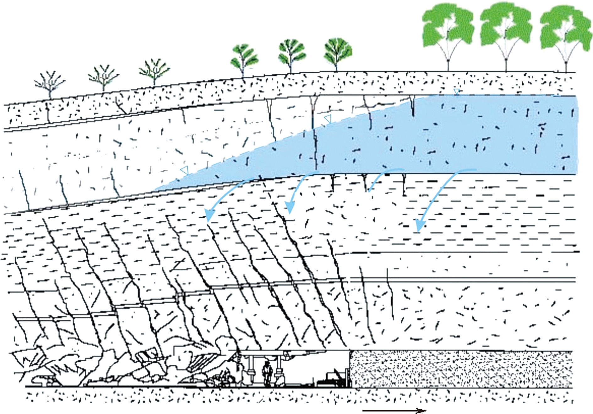 图5 地表生态与地下水位依存关系 3.2 植被适生水位是生态环境保护的核心鄂尔多斯盆地北部地下水主要依靠大气降水,大气降水通过地表松散沙层下渗到基岩界面后形成地下径流,在地形低洼部位形成地表径流流入黄河,正是这样的补径排系统维系了地表生态系统。农作物主要生长在河谷地带,适生水位为1.5~5 m。草本植物主要生长在湿地、河谷、沙地和黄土梁峁,适生水位为0~3 m。乔灌木主要生长在河谷和沙地,适生水位为1.5~8 m。农村生活用水主要来自于水井,水位为3~5 m,城市及工业用水主要来自于河流和水库。 由此可见,维系农作物和植被正常生长的地下水位埋深为1.5~5 m,维系农村和城市生活用水的水源为浅井和河流。矿区地质环境保护的核心是保护地表生态系统,而地表生态系统保护的核心是控制地下水位不发生明显下降。 3.3 采动隔水性变化是生态环境损害的根源在生态脆弱地区,地下水是维系地表生态系统的基础,位于煤层和含水层之间的隔水岩组是保持地下水位稳定的重要地质条件。大量探测和室内研究表明,由于煤炭开采会形成地下空间,导致应力场变化产生动力,隔水层损害产生通道,地下水流向采空区引起水位下降和生态退化。采动隔水性变化示意图如图6所示。