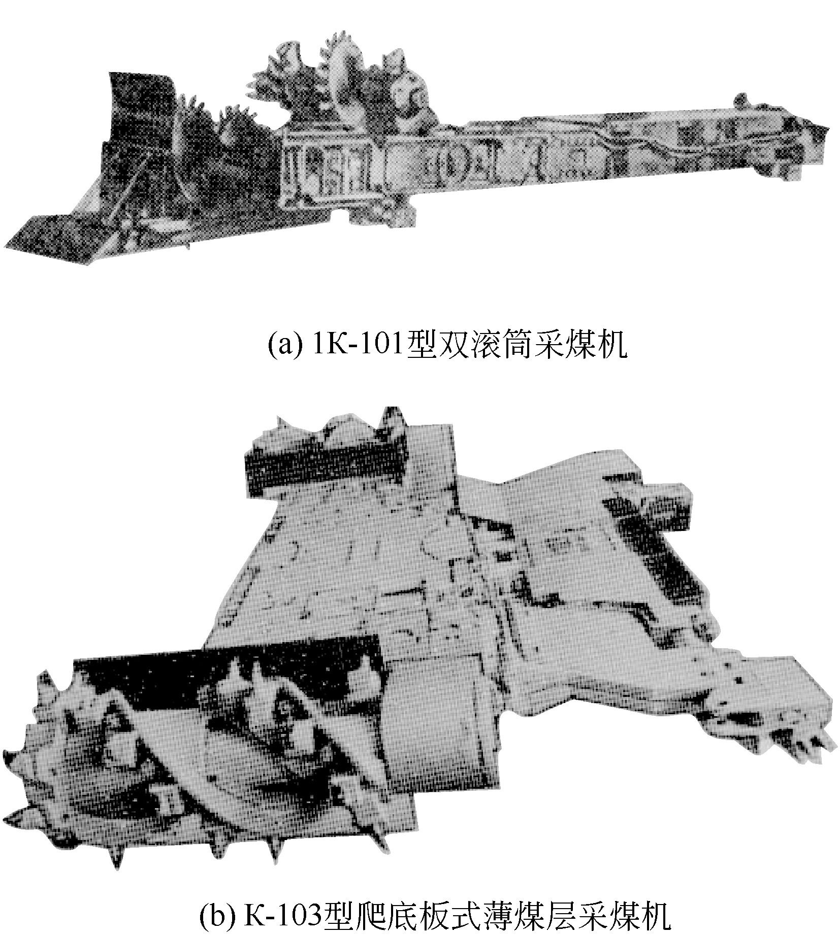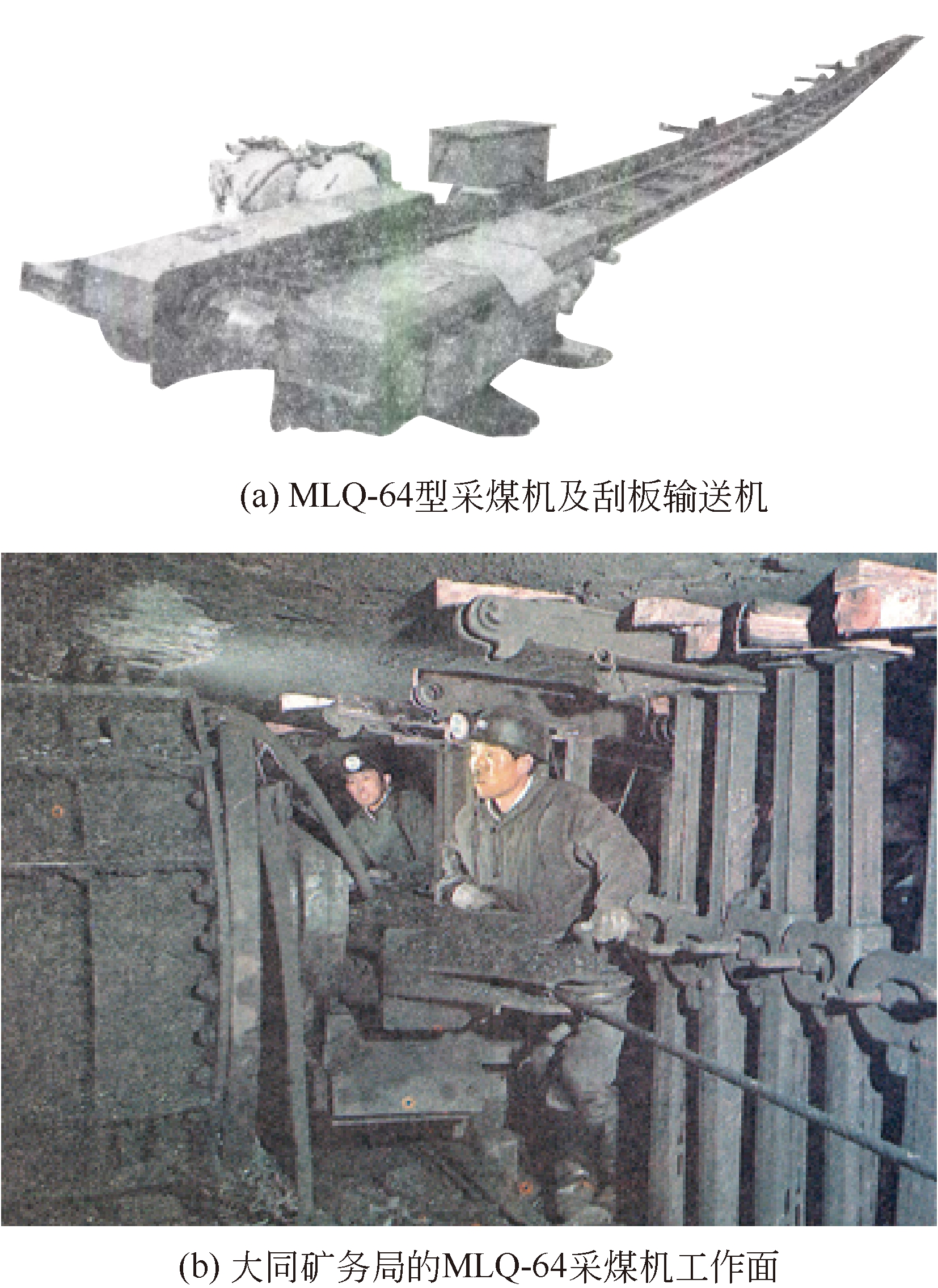 1963年,鸡西煤机厂在学习波兰KWB单滚筒采煤机基础上,设计制造了MLQ-64型固定单滚筒浅截式采煤机,是我国第1台以螺旋滚筒为工作机构、破煤与装煤一体化的联合滚筒采煤机,它与张家口煤机厂仿制波兰的SGW-44型可弯曲刮板输送机搭配成综采机组,如图9(a)所示[25];1966年7月,大同矿务局使用MLQ-64型滚筒式采煤机组,建成了第1个使用国产采煤机的普通机械化采煤工作面,如图9(b)所示,实现了采煤工艺由深截式向浅截式的重大变革。