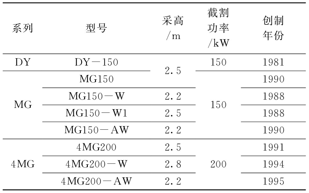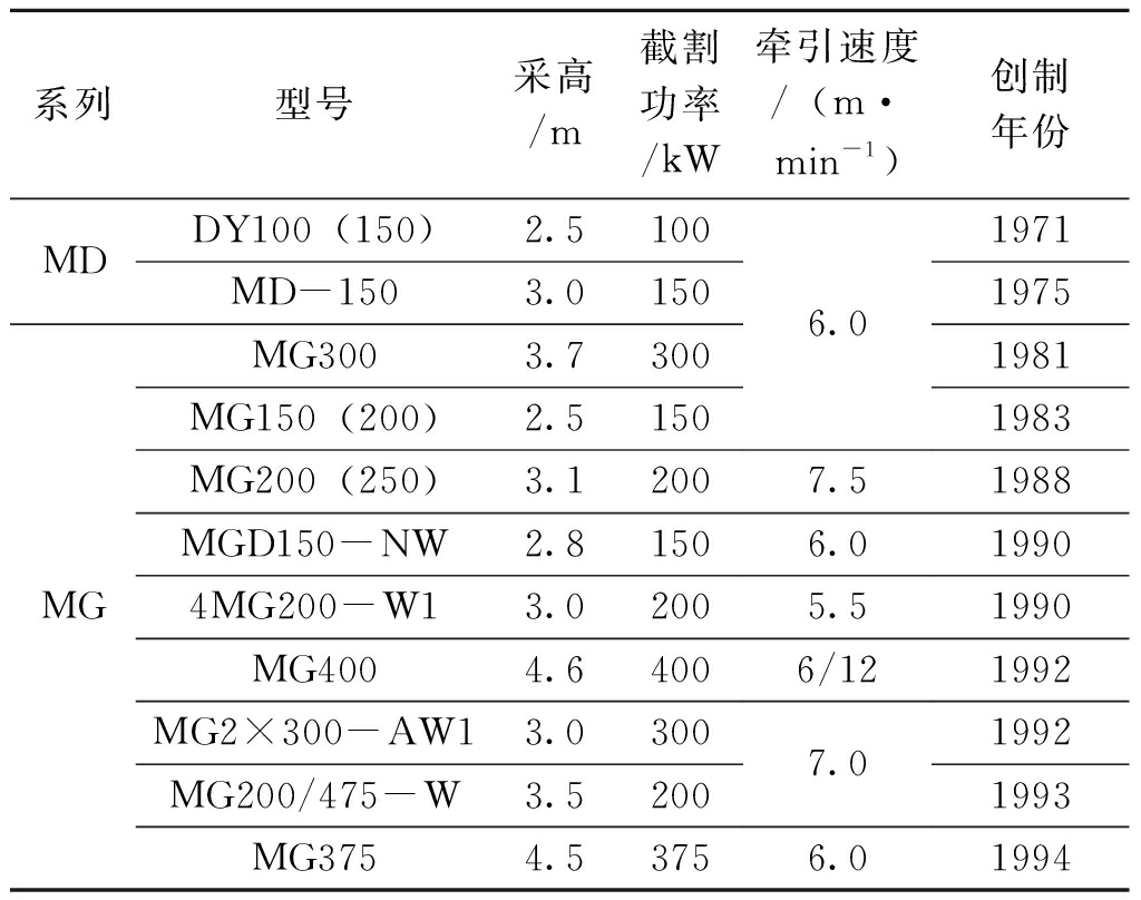 系列型号采高/m截割功率/kW牵引速度/(m·min-1)创制年份MDMGDY100(150)2.5100MD-1503.0150MG3003.7300MG150(200)2.5150MG200(250)3.1200MGD150-NW2.81504MG200-W13.0200MG4004.6400MG2×300-AW13.0300MG200/475-W3.5200MG3754.53756.07.56.05.56/127.06.019711975198119831988199019901992199219931994