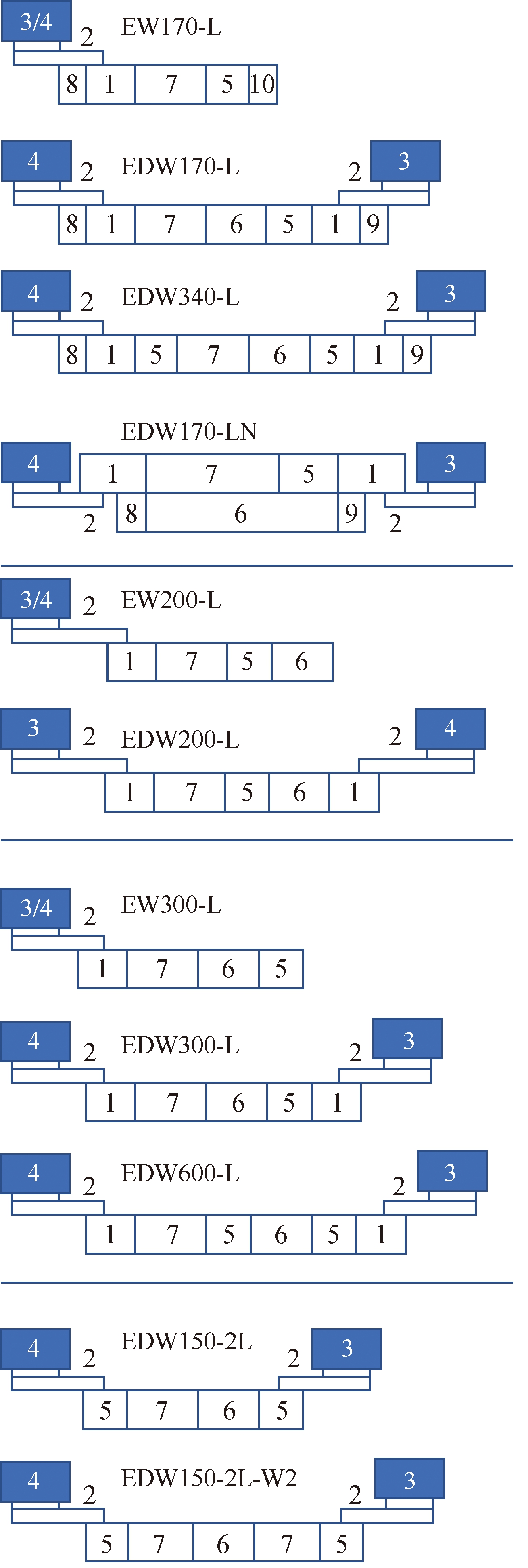 1971年,艾柯夫公司制造出EDW-170-LN型双滚筒薄煤层采煤机,采用液压链牵引或齿销无链牵引的机道内爬底板行走方式,适用于厚度1.3 m以下的薄煤层开采[4];1972年造出EW-200-L型单滚筒采煤机和EDW-200-L型双滚筒采煤机,首次设计了液压操纵的可翻转弧形挡煤板和破碎大块煤的滚筒,装有无线电遥控;同年,推出EDW-300-LN爬底板采煤机,采用煤壁侧槽帮滚柱齿条牵引方式,机载直流电驱动;1973年推出EDW-340-L型采煤机;同年,推出EDW-300-LH型双滚筒采煤机,是摇臂加长机型;1975年推出EDW-380-L型采煤机,工作电压升至3.3 kV;1981年研制出EDW-230-LN型双滚筒采煤机,其特点是设计弯曲摇臂,以增大装载过煤空间。艾柯夫公司L型摇臂采煤机的模块式组合图见图6。