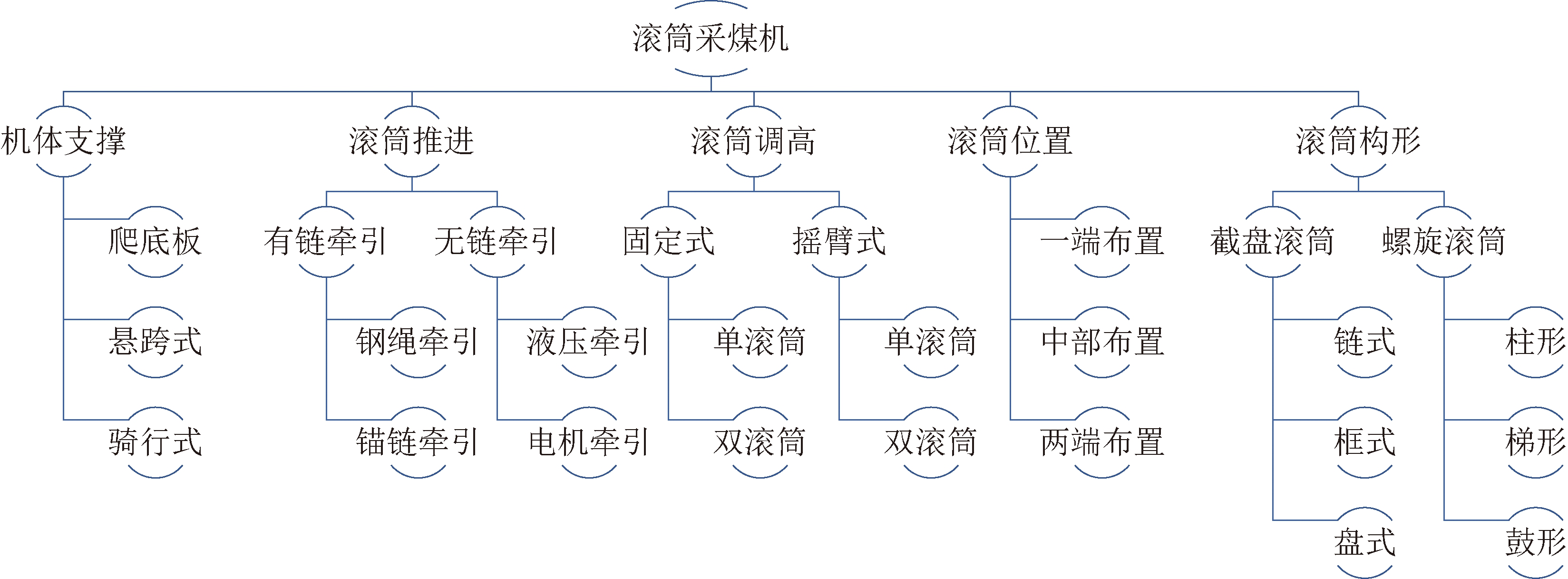 经过70多年的发展,滚筒采煤机的机型不断丰富,机器功能逐渐提升,生产能力成倍增大,智能水平陆续健全。滚筒采煤机基本结构包括采煤机支撑、截割滚筒推进、滚筒高度调节、滚筒布局方式、滚筒结构形式等5个方面,如图2所示,其中有20个机构要素,可组合为不同形式的采煤机构型。例如,爬底板式+锚链牵引+单滚筒+鼓形滚筒的薄煤层采煤机,骑行式+液压无链牵引+双滚筒+螺旋滚筒的厚煤层采煤机等。