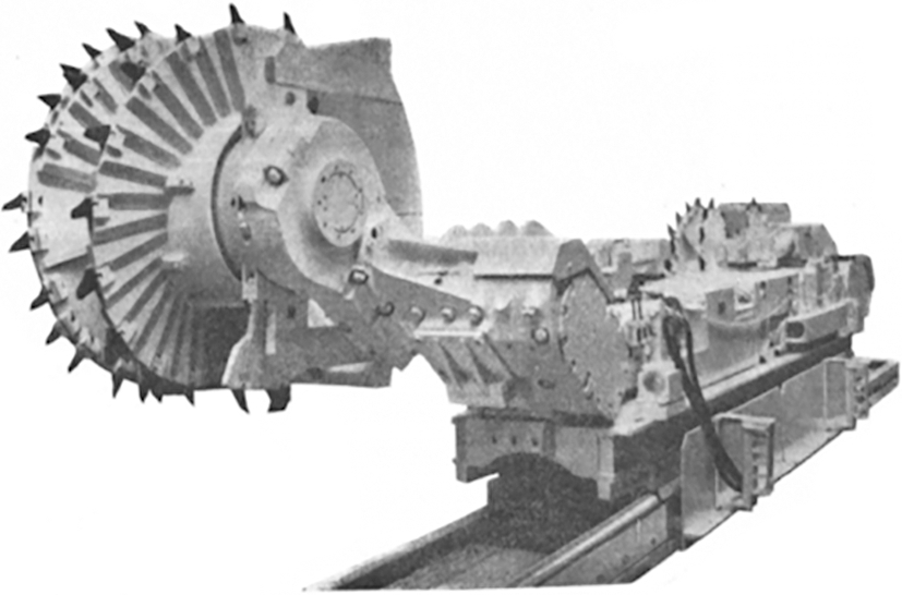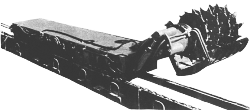 1954年,艾柯夫公司制造出第1台W-SE-Ⅲ型固定滚筒采煤机,电机功率为80 kW,首次采用圆环锚链牵引方式;1958年造出W-SE-Ⅳ型固定单滚筒采煤机,装有固定的截割滚筒和后挂台式装煤犁;1961年推出EDW-200型中部双滚筒采煤机,两个截割滚筒布置在截深中部,可双向采煤,采用液压链牵引;1964年生产EW-170-L型单滚筒采煤机和EDW-170-L型双滚筒采煤机,自此L系列摇臂可调高滚筒采煤机成为该公司的主力机型;1967年推出液压牵引双滚筒采煤机;1970年推出EW-300-L型单滚筒采煤机,首次采用液压驱动的链轮-链轨牵引方式;同年,造出EDW-300-L型和EDW-2×300-L型滚筒采煤机。德国艾柯夫公司的滚筒采煤机如图5所示。