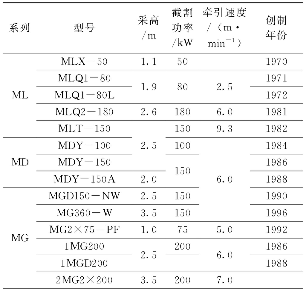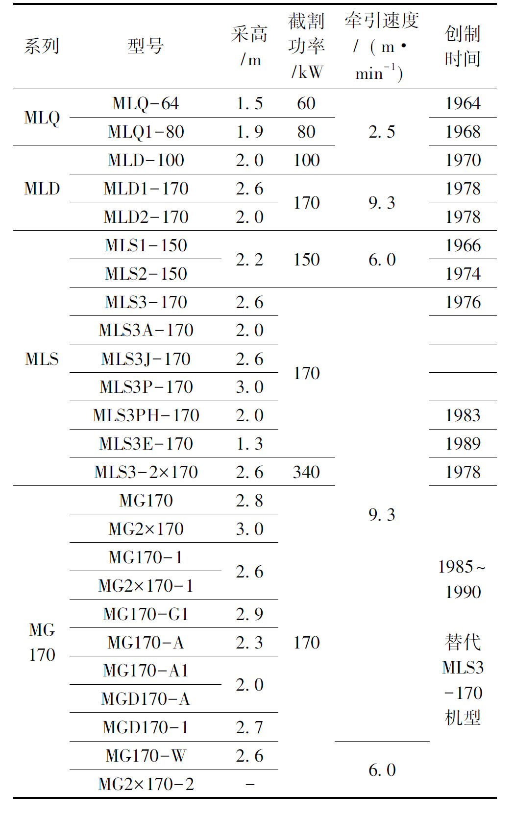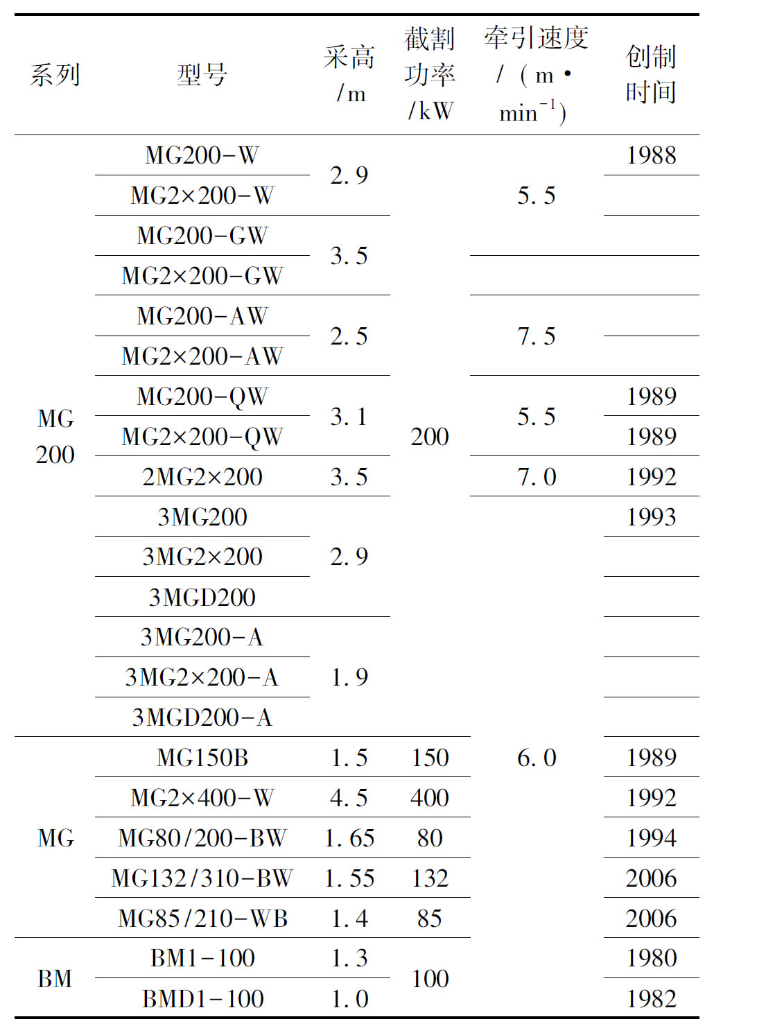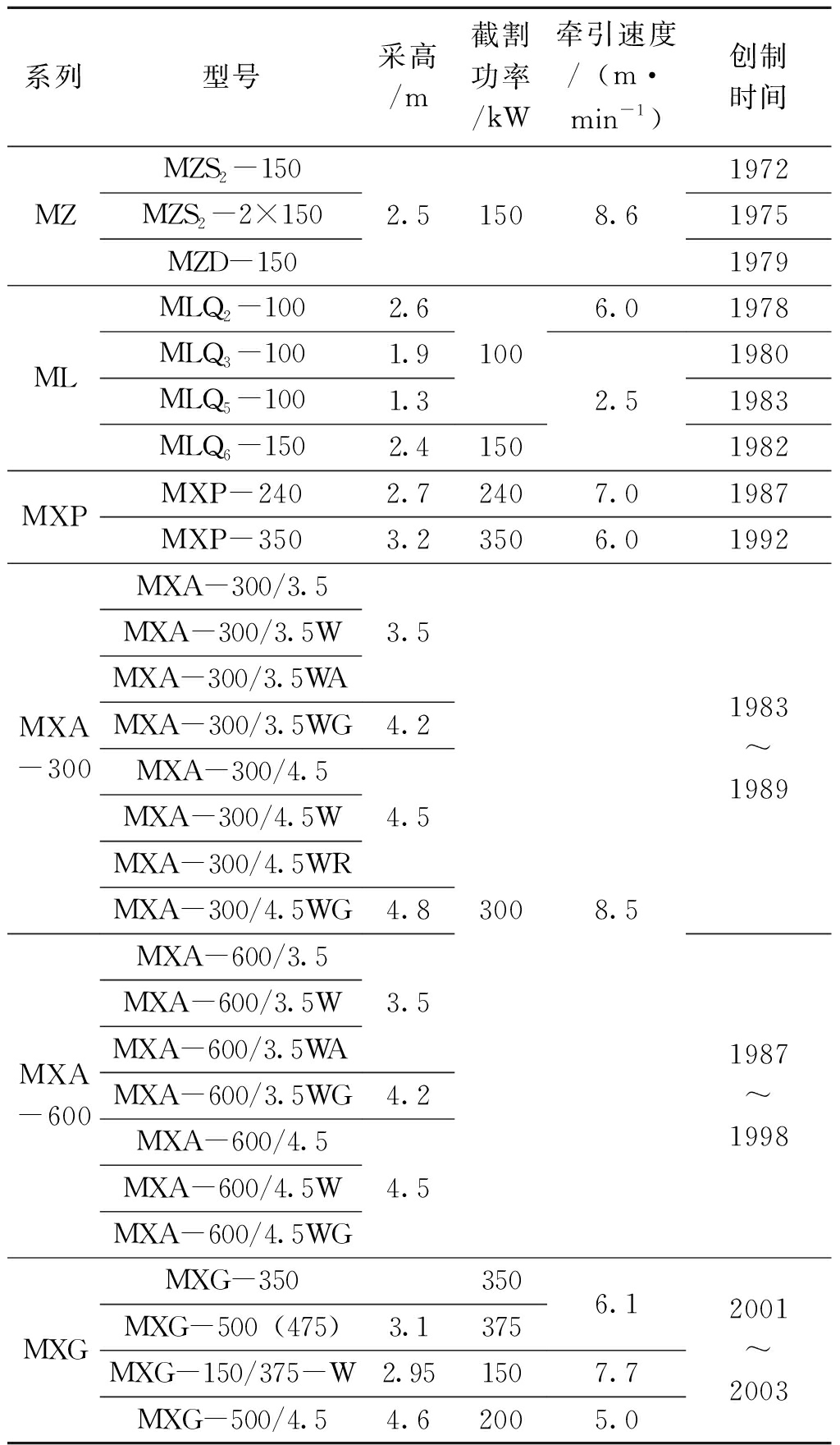 系列型号采高/m截割功率/kW牵引速度/(m·min-1)创制时间MZMZS2-150MZS2-2×150MZD-1502.51508.6197219751979MLMLQ2-1002.6MLQ3-1001.9MLQ5-1001.3MLQ6-1502.41001506.02.51978198019831982MXPMXP-2402.72407.01987MXP-3503.23506.01992MXA-300MXA-600MXA-300/3.5MXA-300/3.5WMXA-300/3.5WAMXA-300/3.5WGMXA-300/4.5MXA-300/4.5WMXA-300/4.5WRMXA-300/4.5WGMXA-600/3.5MXA-600/3.5WMXA-600/3.5WAMXA-600/3.5WGMXA-600/4.5MXA-600/4.5WMXA-600/4.5WG3.54.24.54.83.54.24.53008.51983~19891987~1998MXGMXG-350350MXG-500(475)3.1375MXG-150/375-W2.95150MXG-500/4.54.62006.17.75.02001~2003