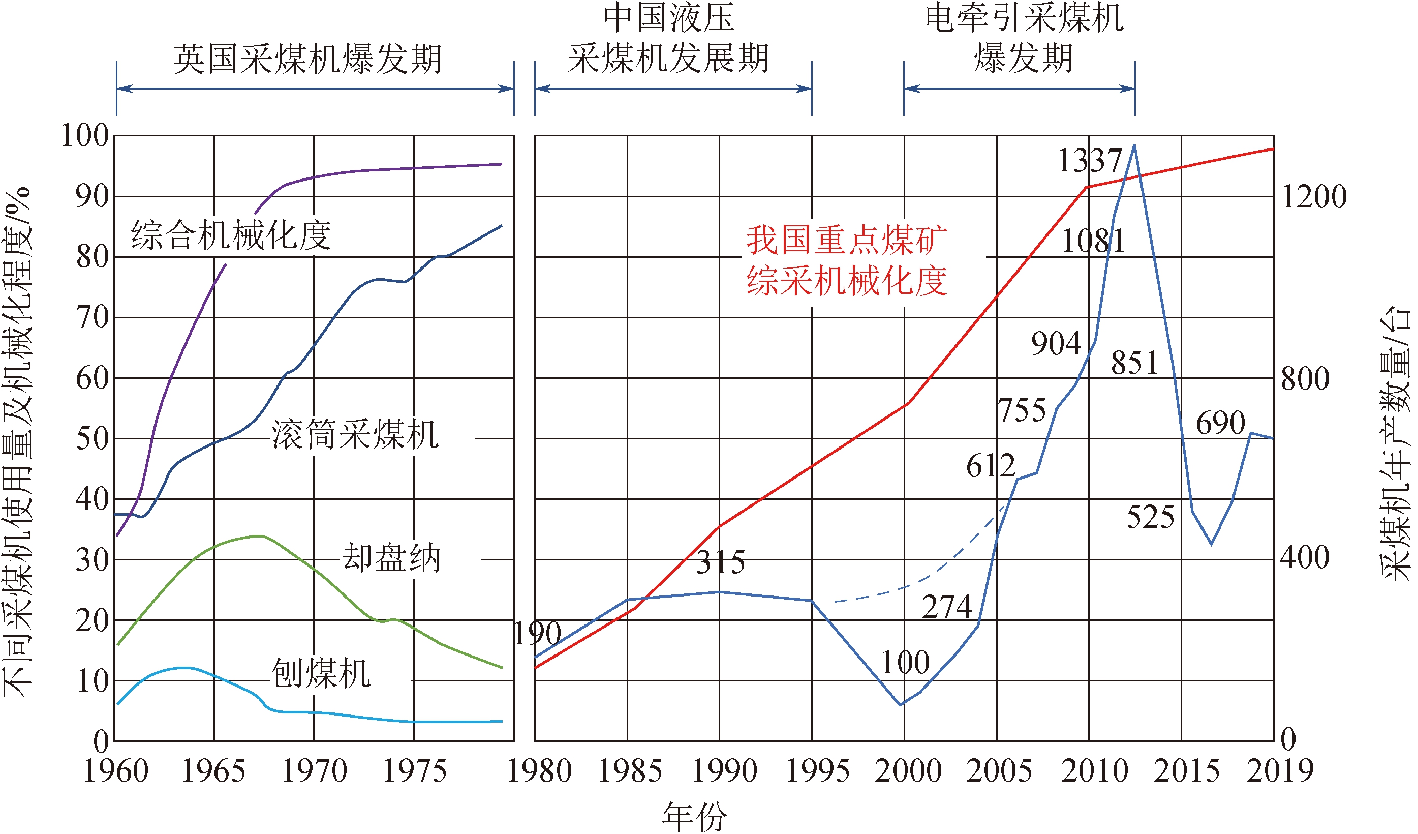 我国自主生产滚筒采煤机比国外晚了10多年,中英两国滚筒采煤机发展态势对比如图19所示,其中的采煤机产量包括电牵引滚筒采煤机。可以看到,自1960年起,英国滚筒采煤机(生产)使用量呈直线增长,促使英国煤矿综采机械化程度在10年内提高了2倍。而我国在1980-2000年期间的采煤机产量不仅没有持续增长,反而在1995-2000年出现了走低态势,这与当时煤炭行业不景气、需求不旺盛有直接关系。在2012-2017年,我国出现第2次采煤机产量走低,这是煤炭供过求与中小煤矿关停双重效应叠加所致。如果没有第1次走低情况出现,我国采煤机发展的合理曲线应是图中虚线连接形成的渐进上升趋势,形成1个从机械牵引采煤机向电牵引采煤机稳步过渡的发展过程。