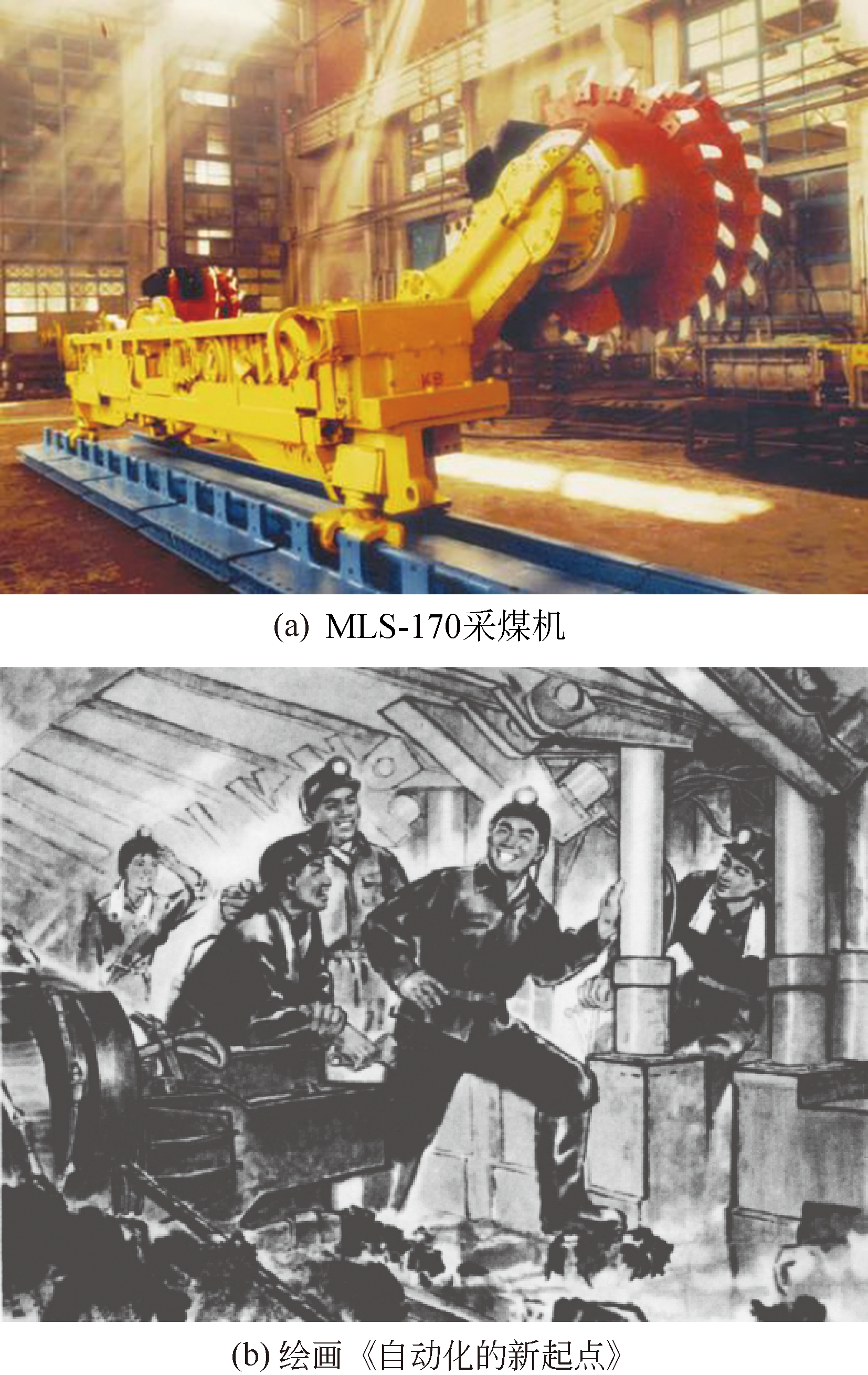 1970年,鸡西煤机厂试制成功东方80型爬底板可调高双滚筒采煤机,装机功率80 kW,截深0.6 m,外部液压牵引,速度0~6 m/min,采高0.5~1.3 m [27];1976年,鸡西煤机厂制造出MLS3-170型双滚筒采煤机,是仿制艾柯夫EDW-170型采煤机,并以此派生出12种系列产品[28-29],阳泉矿务局工人将此当作自动化的新起点并创作了绘画作品,采煤机及绘画作品如图11所示。