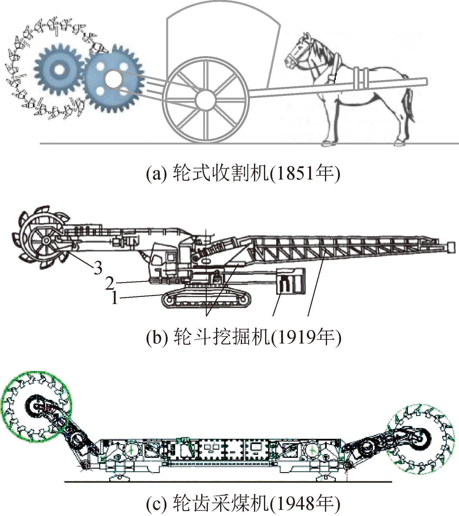 滚筒切割原理最早被用于农业收割机,100多年之后成为采煤机的滚筒切割方式,1919年德国制造了第1台履带式轮斗挖掘机,1948年英国制造出滚筒式采煤机,之后陆续出现了摇臂滚筒采煤机和双滚筒采煤机,三者之间的原理相似性如图1所示。