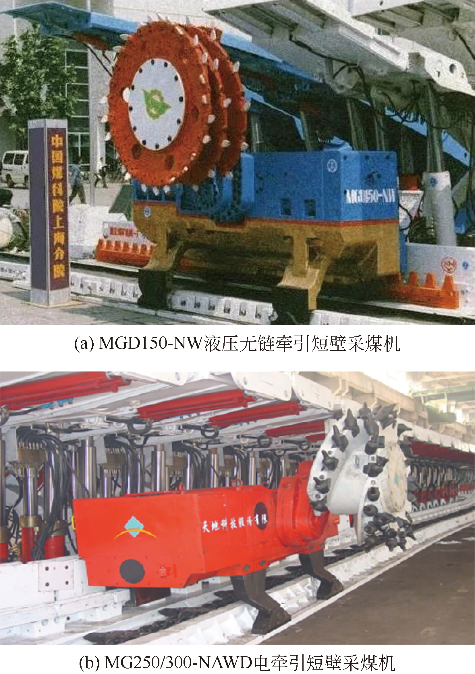 1990年,上海煤研所设计、辽源煤机厂制造出MGD150-NW型液压无链牵引短壁工作面采煤机,如图17(a)所示,装机功率150 kW,滚筒直径1.6 m,机长3 m,摇臂长度805 m,回转摆角270°,可使单滚筒兼作左或右滚筒使用,无需人工“开机窝”,最大采高2.85 m [49];1993年研发成功MGD150-N型有链牵引短壁采煤机,机长3 m,摇臂长615 mm,回转摆角270°,滚筒直径1.6 m,最大采高2.5 m;1994年制造出第1台MGD-N(A)型短机身采煤机,机身长度3 m,这比DY-150的7 m机身长度大幅度缩短;1996年研发出MGD250-NW型短壁采煤机,机长3.38 m,摇臂长874 mm,回转摆角320°,滚筒直径1.8 m,最大采高3 m[50];2002年造出MG250/300-NWD电牵引短壁采煤机,机长3 m,摇臂长905 mm,回转摆角310°,滚筒直径1.8 m,最大采高3 m;2002年造出MG250/300-NAWD型机载交流变频电牵引短壁采煤机,如图17(b)所示,机长3 m,摇臂长615 mm,回转摆角310°,滚筒直径1.8 m,最大采高2.5 m。