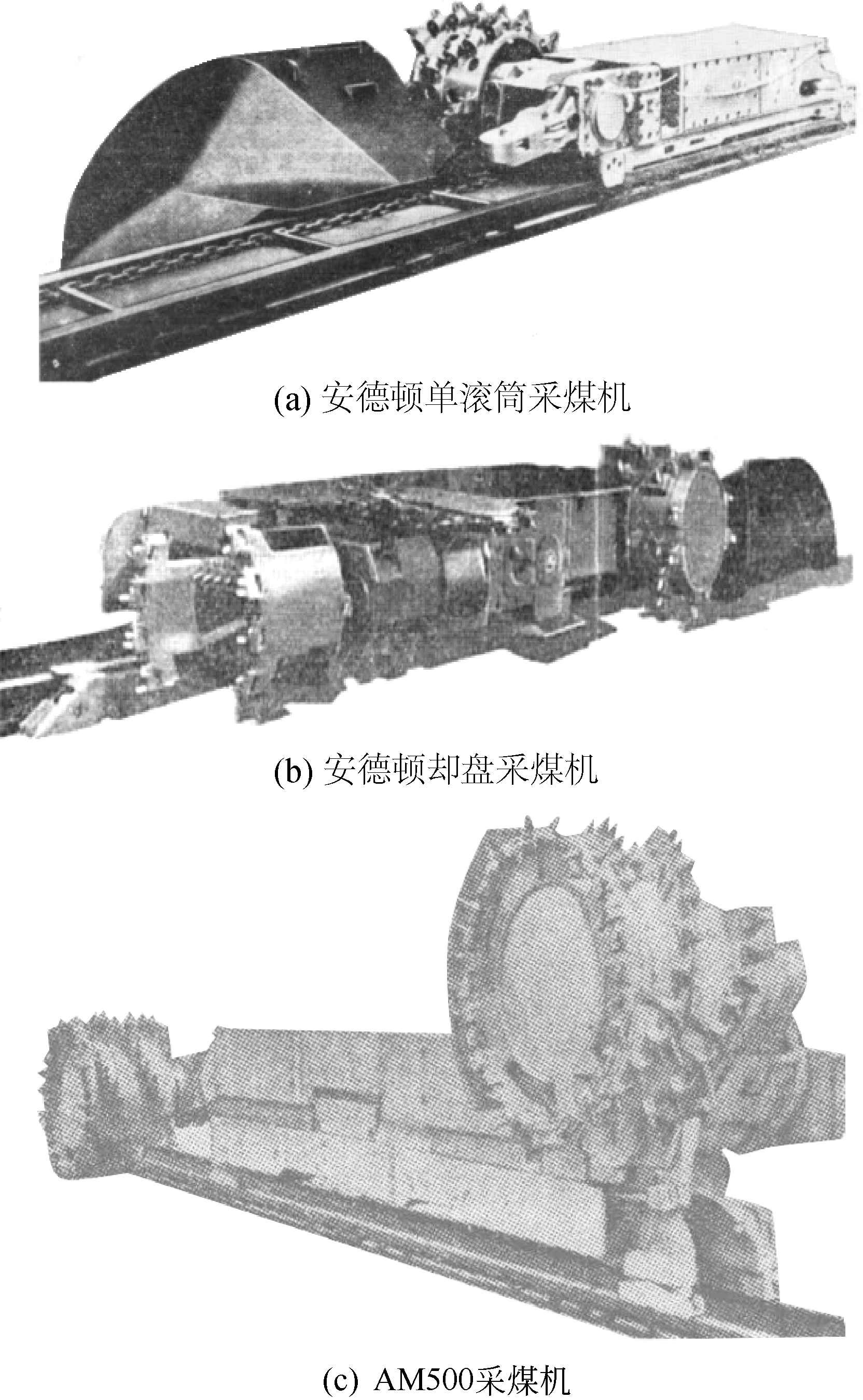 1948年,安德森-鲍伊公司(ANDESON-BOYER)成功改装1台截盘式滚筒采煤机,在法国亚尔沙斯(ALsace)矿区使用,这是滚筒采煤机的起步[1];1952年,时任英国国家煤炭局西部分局主任的詹姆斯.安德顿爵士设计了单向割煤的固定单滚筒采煤机,开创了安德顿系列滚筒采煤机,被认为第1代滚筒采煤机;1954年,安德森-鲍伊公司制造出AB16-安德顿型采煤机;自此,安德森公司成为世界滚筒采煤机研发制造基地。第2代滚筒采煤机(MK-I,1963年)和第3代滚筒采煤机(AM500,1972年)均诞生于该公司。安德森公司创制的不同采煤机规格如表1所示,其中,安德顿单滚筒采煤机、安德顿却盘采煤机和安德森AM500双滚筒采煤机如图3所示。