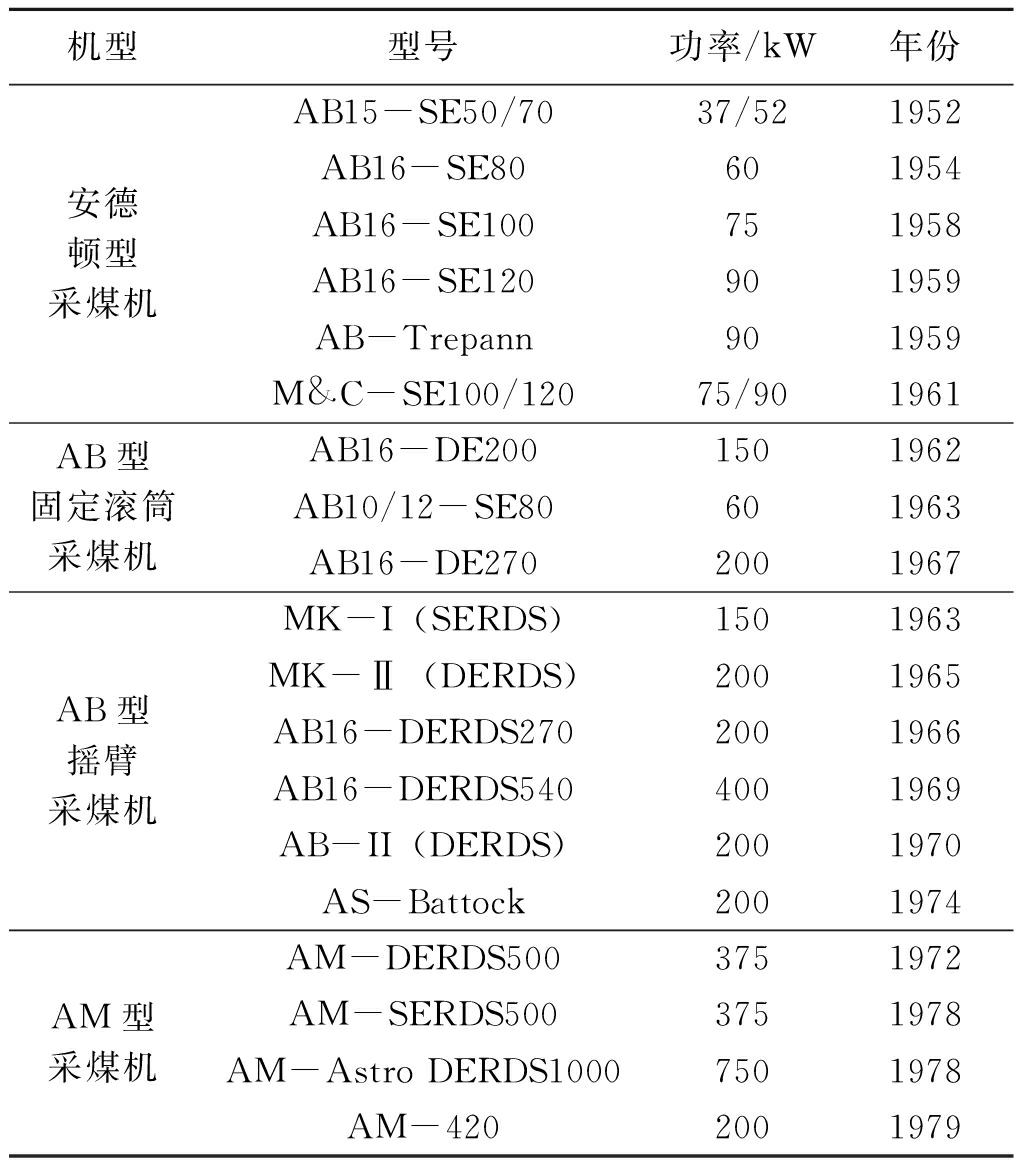 机型型号功率/kW年份安德顿型采煤机AB15-SE50/7037/521952AB16-SE80601954AB16-SE100751958AB16-SE120901959AB-Trepann901959M&C-SE100/12075/901961AB型固定滚筒采煤机AB16-DE2001501962AB10/12-SE80601963AB16-DE2702001967AB型摇臂采煤机MK-I(SERDS)1501963MK-Ⅱ(DERDS)2001965AB16-DERDS2702001966AB16-DERDS5404001969AB-II(DERDS)2001970AS-Battock2001974AM型采煤机AM-DERDS5003751972AM-SERDS5003751978AM-Astro DERDS10007501978AM-4202001979