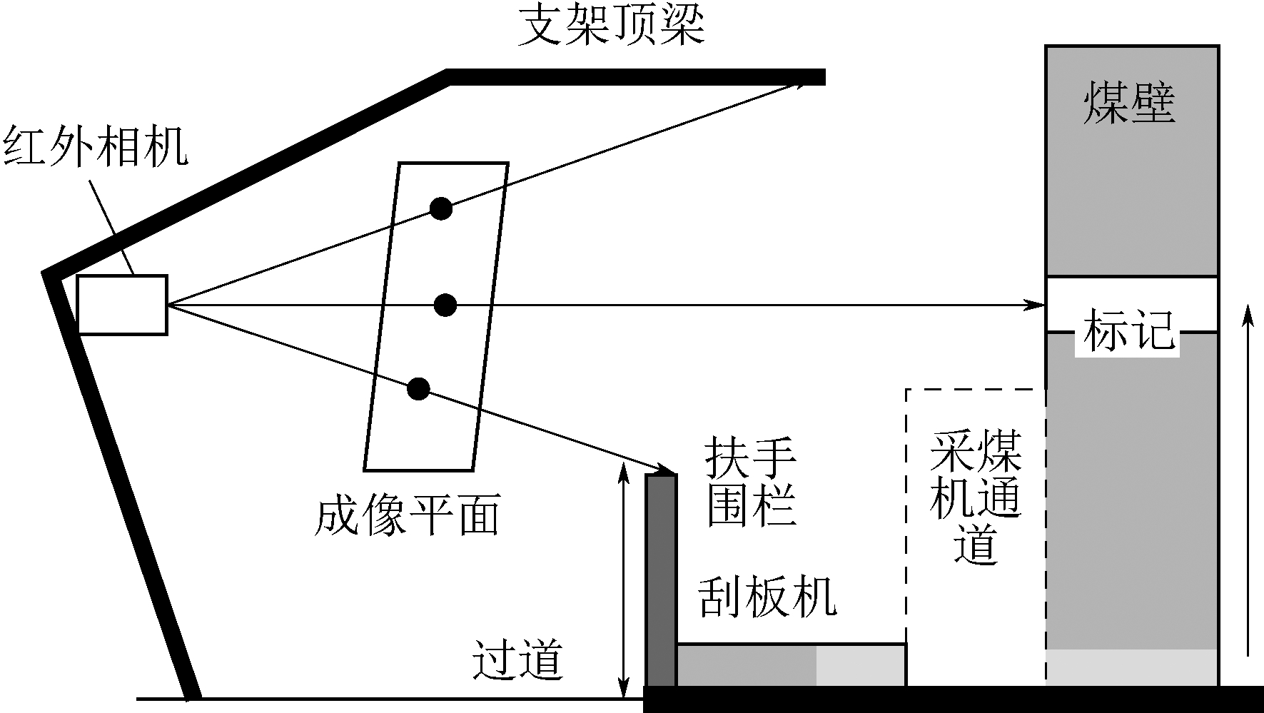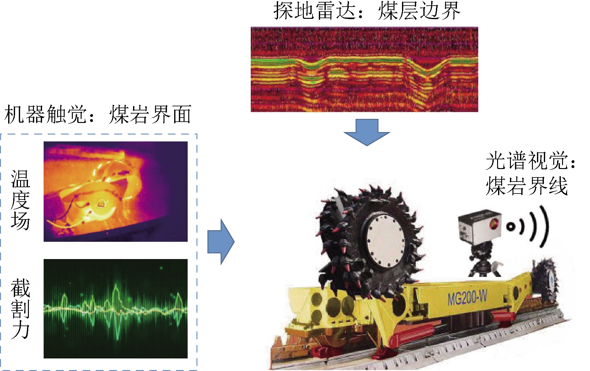 采后机器视觉方法对煤层截割之后的暴露煤壁进行红外线、太赫兹、高光谱及图像扫描,通过机器视觉“看到”的煤岩表面特征,探测煤壁或顶板的煤岩性状差异,从而获得煤岩异构区域分布。