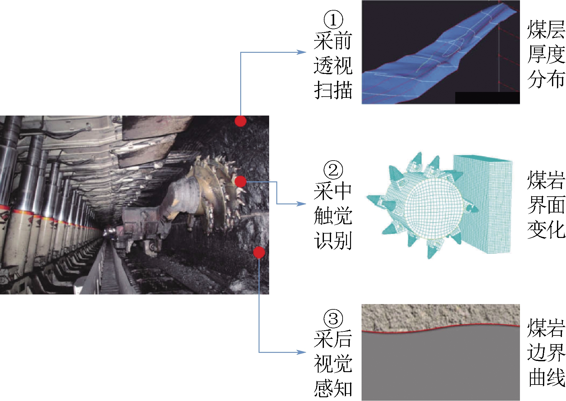该方法利用地质探测技术,在煤层截割之前对内部地质构造进行透视化扫描,获得煤岩曲面分布形态,从而预先为采煤机的截割路径规划提供知识模型。