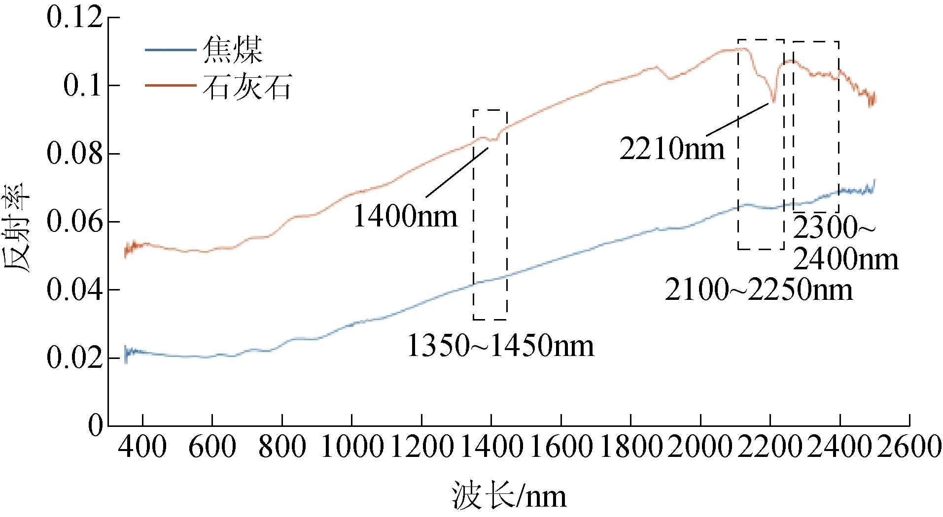 高光谱遥感矿区地物属性是目前最为热门的高光谱技术应用方向之一,起初主要针对露天矿进行遥感观测研究。2003年,德国宇航中心地球观测中心Claudia Kuenzer团队采用卫星高光谱遥感,探测探测了露天矿的煤炭和岩石分布,绘制了煤田植被覆盖、煤火发生区域图[52-53];2011年,成都理工大学林娜采用径向基核函数支持向量机对库普利特矿区的矿物进行分类探测,这是高光谱航空遥感图像和地物反射光谱在矿区岩矿遥感探测分类中的典型应用[54];2014年,东北大学毛亚春(Mao Yachun)等学者研究了霍林河煤矿的褐煤、霍州煤矿的烟煤反射光谱特征[55];2017年,中国矿业大学张昊等学者进行了高光谱成像进行探测煤岩的试验,发现煤与岩高光谱谱线存在显著的差异性,如图9所示[56];2018年,该团队又测试了无烟煤、贫煤、贫瘦煤、瘦煤、焦煤、肥煤、1/3焦煤、气肥煤、气煤、褐煤等煤样的可见光-近红外波段反射光谱特征,煤岩探测准确率达到90%以上[57]。