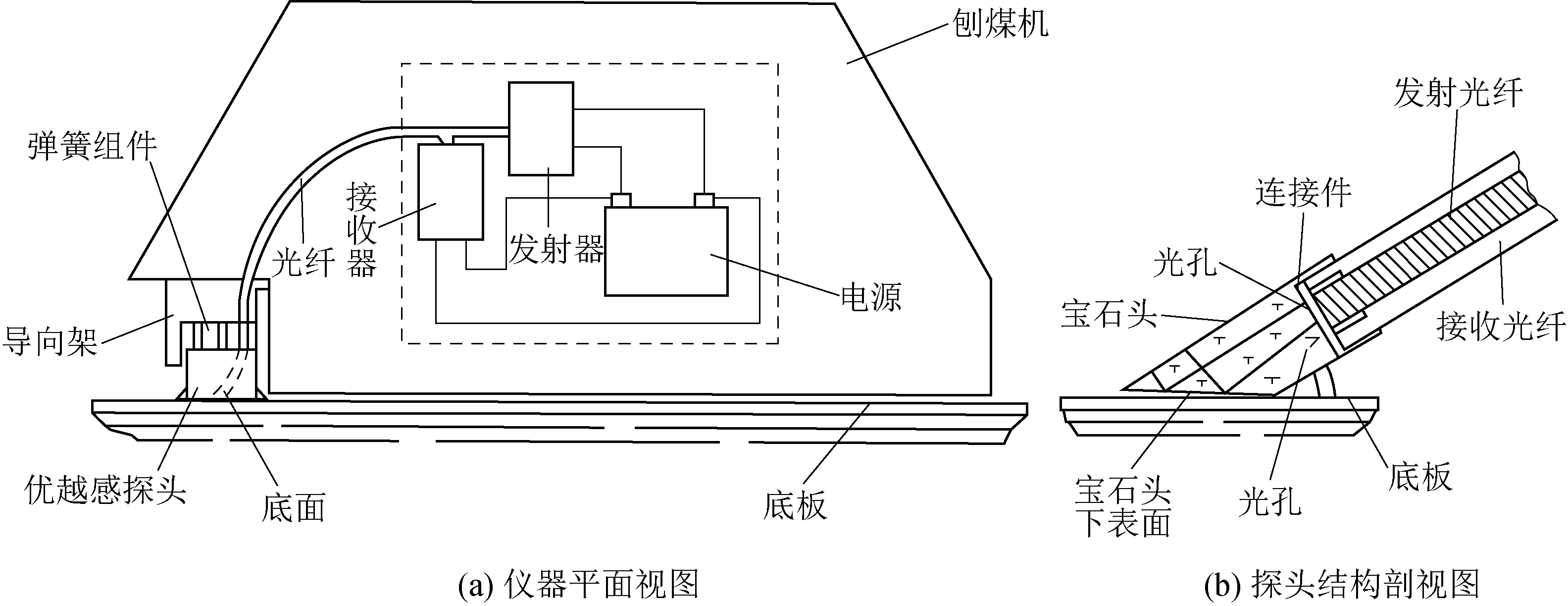 1993年,德国鲁尔煤炭公司(Ruhrkohle AG)与巴特勒研究院(Batelle)等联合研发出刨煤机截割煤岩光纤探测装置,如图7所示,刨煤机底部安装金属保护的紧贴煤岩底板蓝宝石探头,来自发光二极管和激光发射器的850 nm、1550 nm光信号通过光纤、蓝宝石到达煤岩表面,经煤岩表面反射,再由光纤接收,依据反射光强度比率来判别煤岩物性[29]。