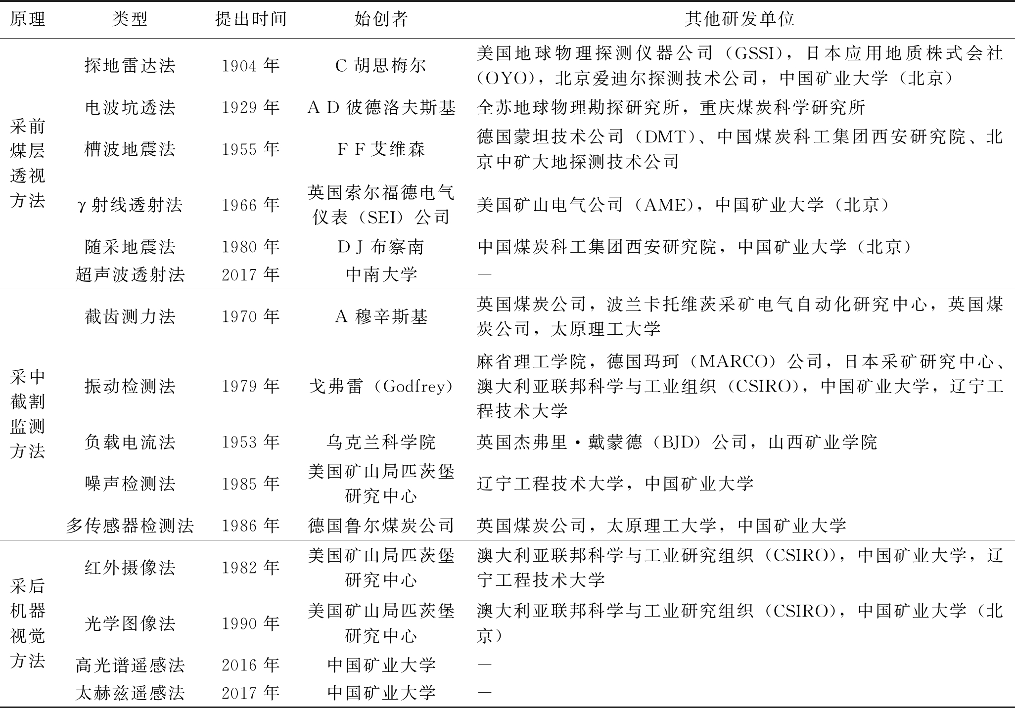 原理类型提出时间始创者其他研发单位采前煤层透视方法探地雷达法1904年C 胡思梅尔美国地球物理探测仪器公司(GSSI),日本应用地质株式会社(OYO),北京爱迪尔探测技术公司,中国矿业大学(北京)电波坑透法1929年A D 彼德洛夫斯基全苏地球物理勘探研究所,重庆煤炭科学研究所槽波地震法1955年F F艾维森德国蒙坦技术公司(DMT)、中国煤炭科工集团西安研究院、北京中矿大地探测技术公司γ射线透射法1966年英国索尔福德电气仪表(SEI)公司美国矿山电气公司(AME),中国矿业大学(北京)随采地震法1980年D J 布察南中国煤炭科工集团西安研究院,中国矿业大学(北京)超声波透射法2017年中南大学-采中截割监测方法截齿测力法1970年A 穆辛斯基英国煤炭公司,波兰卡托维茨采矿电气自动化研究中心,英国煤炭公司,太原理工大学振动检测法1979年戈弗雷(Godfrey)麻省理工学院,德国玛珂(MARCO)公司,日本采矿研究中心、澳大利亚联邦科学与工业组织(CSIRO),中国矿业大学,辽宁工程技术大学负载电流法1953年乌克兰科学院英国杰弗里·戴蒙德(BJD)公司,山西矿业学院噪声检测法1985年美国矿山局匹茨堡研究中心辽宁工程技术大学,中国矿业大学多传感器检测法1986年德国鲁尔煤炭公司英国煤炭公司,太原理工大学,中国矿业大学采后机器视觉方法红外摄像法1982年美国矿山局匹茨堡研究中心澳大利亚联邦科学与工业研究组织(CSIRO),中国矿业大学,辽宁工程技术大学光学图像法1990年美国矿山局匹茨堡研究中心澳大利亚联邦科学与工业研究组织(CSIRO),中国矿业大学(北京)高光谱遥感法2016年中国矿业大学-太赫兹遥感法2017年中国矿业大学-