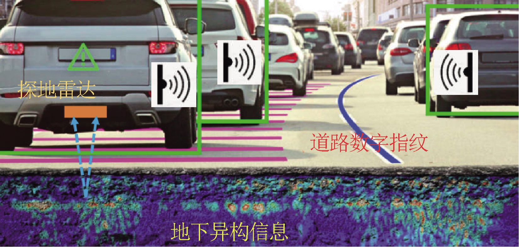 最新的数字化探地雷达具有快速准确探测能力,它被创新性地用于自动驾驶汽车定位与导航。2019年,美国地球物理探测仪器公司研发出一种名为TerraVision探地雷达导航系统,利用探地雷达动态感知地下3 m以内的岩石、树根和管道等异构物体,将这些信息构建路面地下3D指纹地图,在汽车上配置定位探地雷达(Localizing ground penetrating radar,LGPR),即能借助指纹地图确定行驶位置和方向,而且车辆之间能相互传递位置信息,无需依赖GPS和车载视觉、扫描雷达的感控,如图4所示。近期,麻省理工学院也宣布研发成功基于探地雷达的自动驾驶汽车导航技术。美国威森(Wave Sense)公司公布了探地雷达导航驾驶系统,提升自动驾驶汽车安全性,在90 km/h车速下的定位误差小于25 mm。