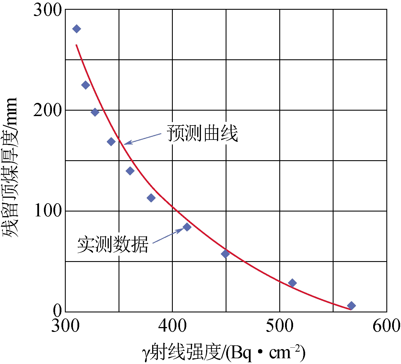 1988年,中国矿业大学北京研究生部孟惠荣等学者在煤矿现场测量了岩层自然γ射线的大量数据,其辐射强度规律如图5所示,泥岩和页岩的放射性强度比煤的放射性高出4倍,泥质沙岩的放射性强度比煤高出3倍[14]。1993年,中国矿业大学北京研究生部秦剑秋等学者改装1台退役的FD-300γ谱仪,使用Cs137源产生脉冲,在门头沟煤矿5号煤层进行了煤岩界面探测试验,煤层厚度与自然γ射线强度如图6所示,对于厚度100~300 mm顶煤的探测误差约为40 mm,对于厚度小于100 mm顶煤的探测误差小于20 mm[15]。