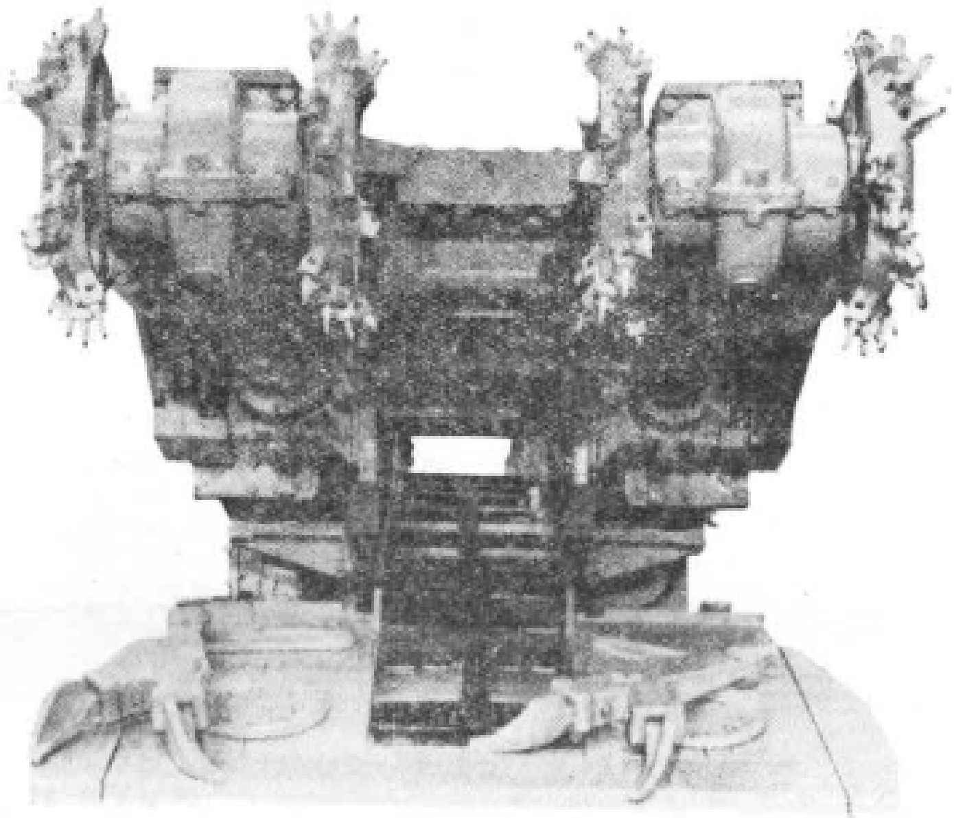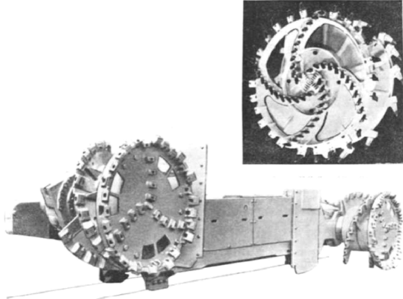 1940年,英国安德森公司生产出AB15型截杆式截装机,如图3所示,设有立式双截杆和底截盘的复合截割机构,截杆立柱直径约20 cm,底部直径约40 cm,立柱周围排列4条截齿,这当属第1个小直径截齿滚筒。1948年,美国利诺斯(Lee-Norse)公司研制出CM-48型截盘式连采机,如图4所示,设有4个装在立轴上的转动截盘,它是盘式截割滚筒的首次应用,也是采煤机滚筒端盘结构的雏形。