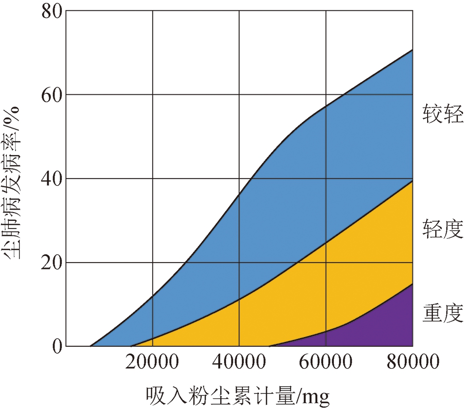 煤尘浓度过高将严重影响矿工健康,也是煤尘火灾和爆炸事故的主要根源。西德曾对13个煤矿1800名井下工人的工作环境和身体状况进行过跟踪统计,结果表明,矿工尘肺病的发病原因与其在工作面的呼吸性粉尘量密切相关,引起尘肺主要是5 μm以下的呼吸性粉尘。矿工吸入煤尘累计值对尘肺发病率的影响如图18所示[45]。早在1970年,英国规定长壁工作面粉尘浓度应小于8 mg/m3。1974年,西德对井下工作地点空气中允许的细粉尘浓度制定严格要求,在石英含量低于5%的工作面,允许粉尘浓度为4 mg/m3;在石英含量高于5%的工作面,允许粉尘浓度为0.15 mg/m3。这些控尘要求推动了采煤机抑尘技术改进,采煤机控尘途径主要是截割工艺减尘、滚筒喷雾降尘、吸尘滚筒除尘。