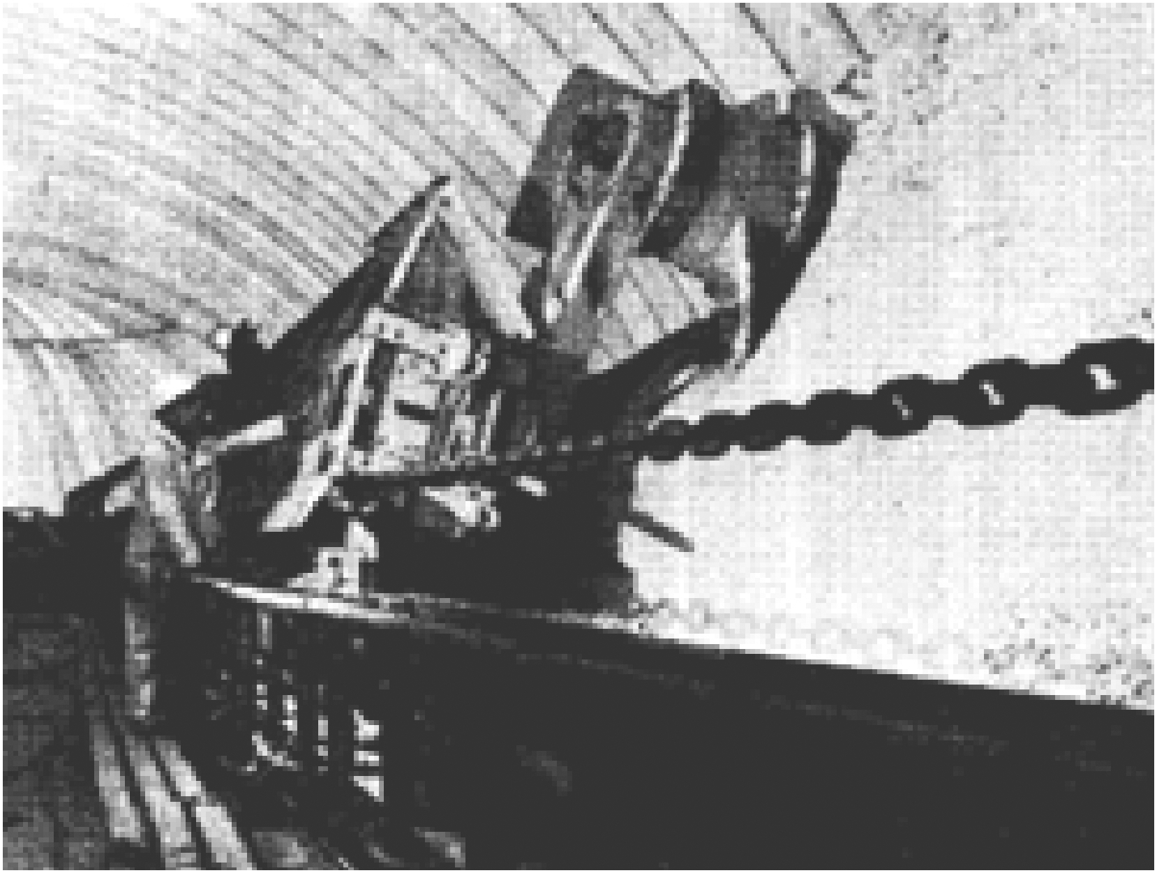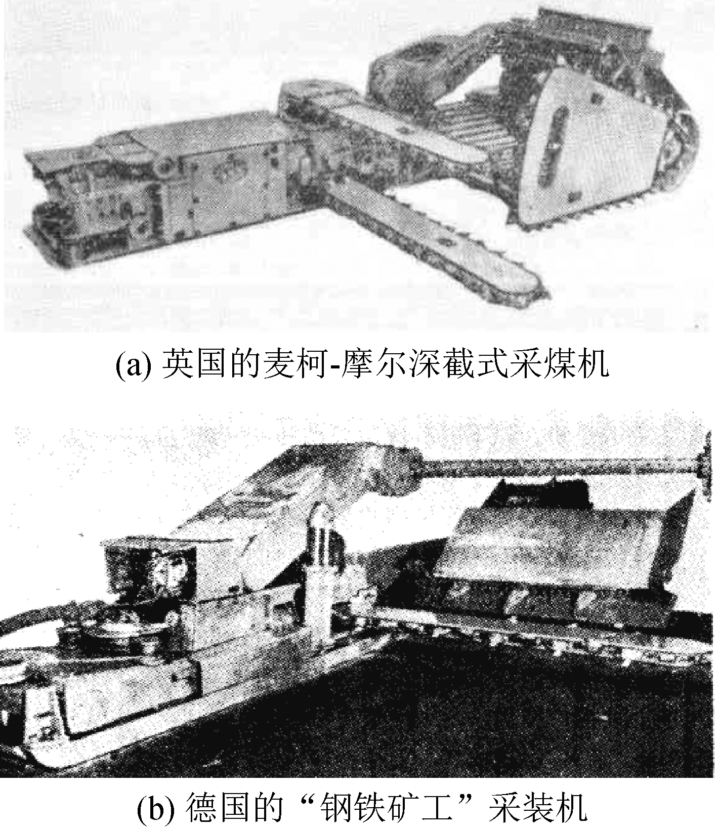 1912年,截煤机获得了英国专利,但当时没有设计出配套的机械化装煤设备,因而未能付诸实际应用。1925年,德国克纳普机械制造厂生产出第1台长壁工作面采煤机装煤机器。1934年,英国生产并应用了麦柯-摩尔(Meco-Moore)深截式采煤机,如图2(a)所示,1938年德国埃克霍夫公司制造出“钢铁矿工”型采装机,如图2(b)所示,底部是截链,上部是横置截杆,截杆端部是截盘,它们的截割机构创新对长壁工作面滚筒采煤机起到了决定性的推动作用[1]。