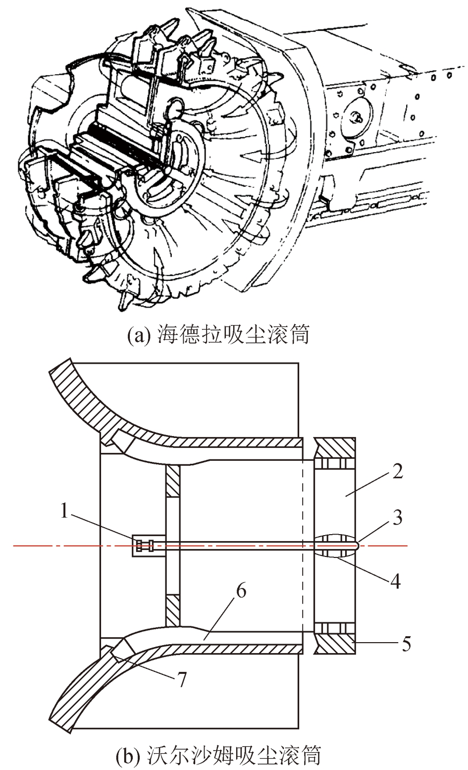 1982年,英国煤炭公司和海德拉刀具公司研制出吸尘滚筒,如图23(a)所示,它基于高压水射流引射效应,在滚筒轴上均匀布置若干引射器以负压吸尘,降尘效果比传统的喷雾滚筒提高60%~80%。美国对这种吸尘滚筒也进行了井下试验,在采煤机司机工作位置的粉尘降低约40%[52]。这种吸尘滚筒既能有效控制煤尘,又把大量新鲜风流吸向截煤区,实现了降低煤尘和甲烷浓度一体化控制。到1990年,英国煤矿使用约900台海德拉吸尘滚筒。2000年,徐州矿务局也研制出吸尘滚筒,在旗山矿13202工作面的4MG-200W采煤机上进行试验,采煤机回风侧5 m处的粉尘从280 mg/m3降到50 mg/m3,降尘率为82.1%,采煤机司机位置的粉尘浓度由116 mg/m3降至15 mg/m3,降尘率为91.8%[53]。