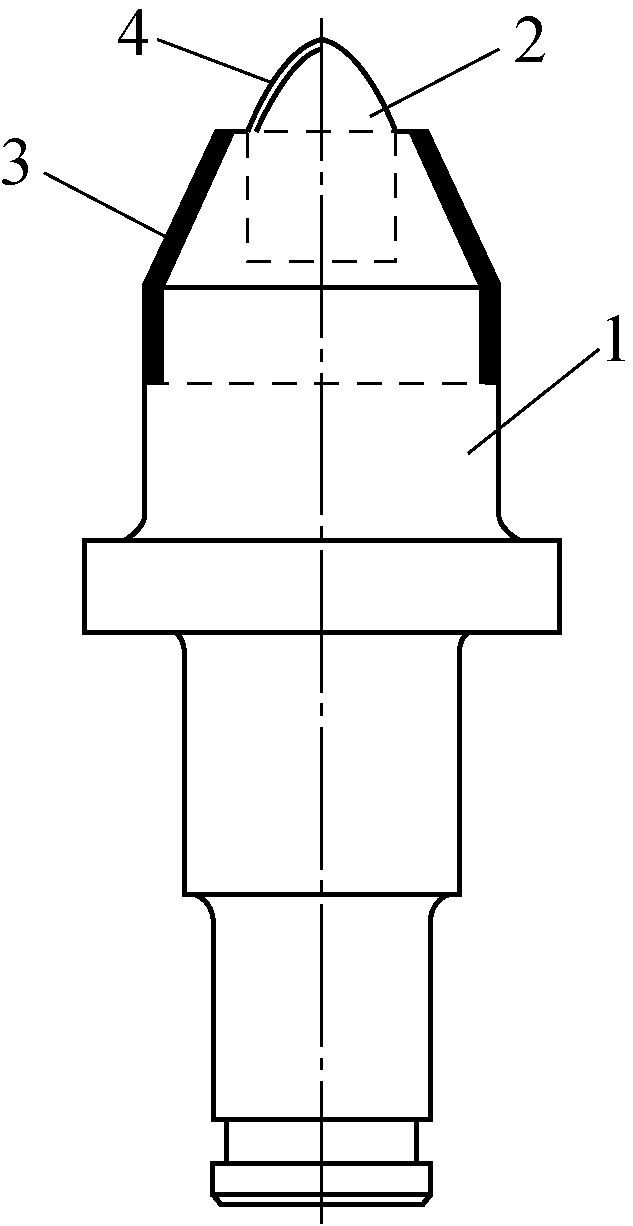 焊接复合的耐磨截齿是加热熔融超硬材料粉末,在截齿表面焊接熔覆一个微米级厚度的耐磨涂层,主要方法有堆焊、钎焊、激光熔覆、等离子熔覆等。