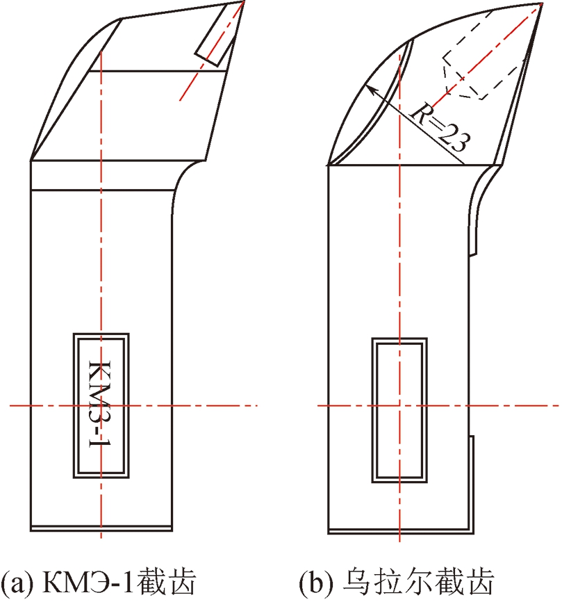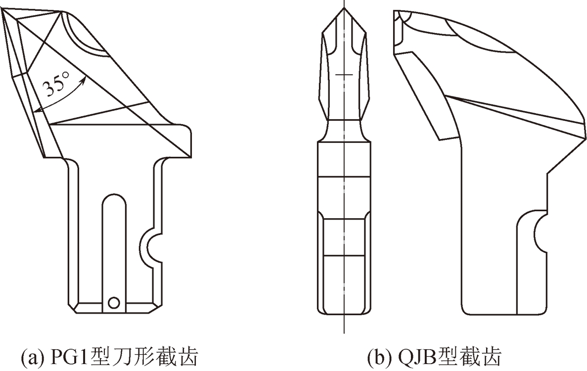 1966年,我国自主研制的MLQ1-80型采煤机采用小镐形截齿。1978年,平岗煤矿截齿厂设计出PG1新型刀齿,如图13(a)所示,截齿消耗量降低60%~90%。1975年,国产MD-150型采煤机采用圆锥形截齿。1982年,无锡采煤机械厂研制出DY-150型采用径向刀齿。1987年,上海煤矿机械研究所研制了QJB型径向刀齿,如图13(b)所示,在晋城矿务局王台铺矿和大同矿务局忻州窑矿进行了工业性试验,截割功率下降17%~22%,粉尘浓度下降17%~30%,块煤率提高5.3%~7.3%[12]。此外,晋城煤业集团王台铺矿曾对镐型截齿和刀型截齿进行了现场对比,镐型截齿比刀型截齿使用效果更好,每万吨采煤的镐形截齿消耗比刀形截齿降低了84%,镐形截齿的齿座磨损降低70%,截割比能耗下降22%,回采块煤率提高4%,使用镐型截齿的更换截齿和滚筒等辅助工作时间减少23%[13]。