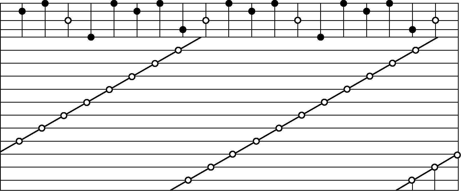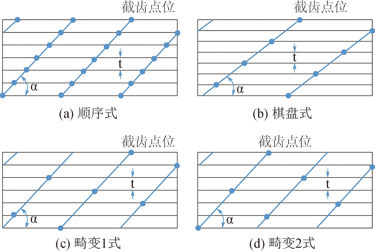 截割滚筒上的截齿布置形态决定了采煤机割煤效率,截割滚筒的螺旋叶片头数、截齿排列形式、截线距大小、单位切割面积的截齿数量对割煤性能至关重要。螺旋滚筒上的截齿主要有4种排列形式,即顺序式排列、棋盘式排列、畸变1式排列和畸变2式排列,4种截齿排列的切削图如图9所示。实际上,切削图是截齿的最大切削深度轨迹,其断面形状直接影响落煤块度。截齿点位的形状越大、越方正,割煤效果越好,反之越差。一般情况下,双螺旋线的截齿可排成顺序式和棋盘式,三螺旋线的截齿可排成顺序式、畸变1式和畸变2式,四螺旋线的截齿可排列成顺序式、棋盘式、畸变1式和畸变2式。截割中硬煤层的滚筒直径小于1.6 m时,通常采用双头螺旋滚简;截割硬煤层的滚筒直径大于1.8 m时,通常采用3头螺旋滚筒[7]。