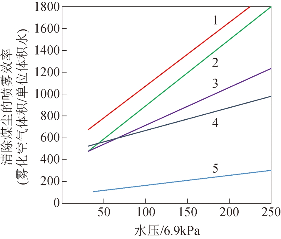 在截割滚筒落煤时,特别是同时切割岩石的情况下,会产生高浓度的细粉尘,设置内外喷雾系统可使粉尘浓度大幅度下降。内喷雾是通过安装截割滚筒上的喷嘴直接向截齿的切割点喷射水雾,实现“湿式截割”,以防止摩擦火花和抑制粉尘。外喷雾是从截割部、摇臂或挡煤板喷出水雾来覆盖尘源,使粉尘湿润沉降。试验表明,最有效的降尘措施是内喷雾,其次是外喷雾。1971年,英国学者提出截割煤层时喷洒水雾,可以抑制煤尘燃爆事故,英国矿山安全研究所对此进行了系统试验。1972年,英国安德森公司制造的AM500采煤机滚筒上安装了内外喷雾系统和文丘里降尘系统。1976年久益公司生产的1LS采煤机把冷却喷雾水流经滚筒轴心孔到螺旋叶片外缘弯管上的喷嘴进行齿面喷雾灭尘。1978年,美国研发出被称为“采煤机除尘器”的喷雾装置,在采煤机周围产生强大的交叉气流,有效遏制尘云扩散,使采煤机司机周围的粉尘浓度降低50%~60%,再配合外喷雾系统,工作面降尘率可达70%~80%,到1982年,美国煤矿已有24个工作面采用了“采煤机除尘器”。美国矿业局开展了多种喷嘴降尘性能试验,如图20所示,从中可见雾化喷嘴的降尘效果最好,但这种喷嘴存在易损坏、易堵塞的问题,限制了在井下推广使用[49]。