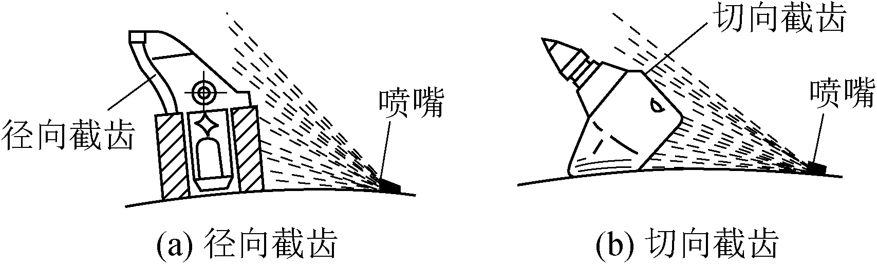 滚筒采煤机采用内喷雾时,喷嘴应布置在截齿后侧,如图21所示。这种布置形式不仅能获得最好的降尘效果,而且功耗最小,喷射的水雾对截齿还有冷却作用,有益于提高截齿使用寿命[45]。英国艾克(Aco)公司研制了多种型式的内喷雾截齿,截齿体内有水道和内喷雾孔,喷雾水流经截齿体后再从截齿端部喷射出去,提高了灭尘效果,减少了喷雾用水量,也降低了商品煤含水量。
