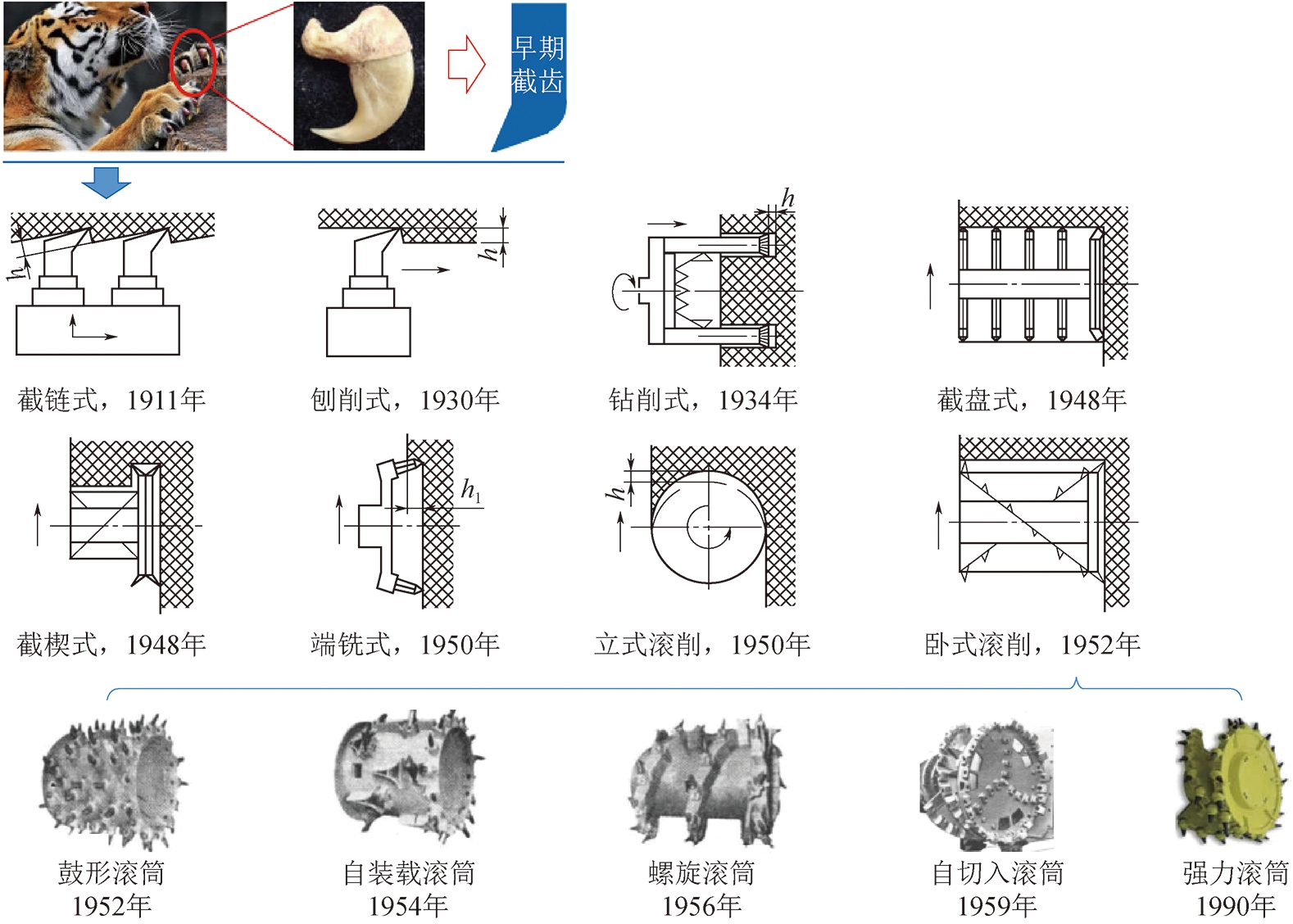 随着人们对截割机理认识不断深入,采煤机的截割机具不断改进(见图1)。截割机具从最初的直线切削方式发展为旋转切削方式,采煤机截割效率得以显著提高。在20世纪30年代到50年代期间,人们进行了钻削式、截盘式、截楔式、端铣式、立式滚削、横式滚削等多种截割结构设计和试验,最终筛选出横置滚筒铣削式截割机构,成为采煤机的主流截割结构。从1952年起,采煤机滚筒截割机构经历了鼓形滚筒、自装载滚筒、螺旋滚筒、自切入滚筒、强力滚筒的5次变革。当今,螺旋截割滚筒已是采煤机普遍采用的高效截割机构,截齿切削圆直径从当初的0.8 m发展到目前的4.3 m,单个滚筒截割功率从10 kW提高到1100 kW。