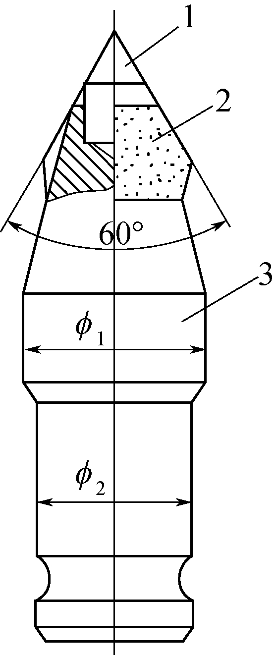 超硬材料复合截齿是第2代耐磨截齿,常用于镐形截齿,其结构如图16所示。这种截齿既有超硬齿尖与齿体的复合结构,也有齿尖、齿体、齿柄表面的复合耐磨层,可有效提高截齿的整体耐磨寿命。超硬材料复合截齿分为镀膜型、烧结型、焊接型等,在煤矿应用最多的是焊接型复合截齿。